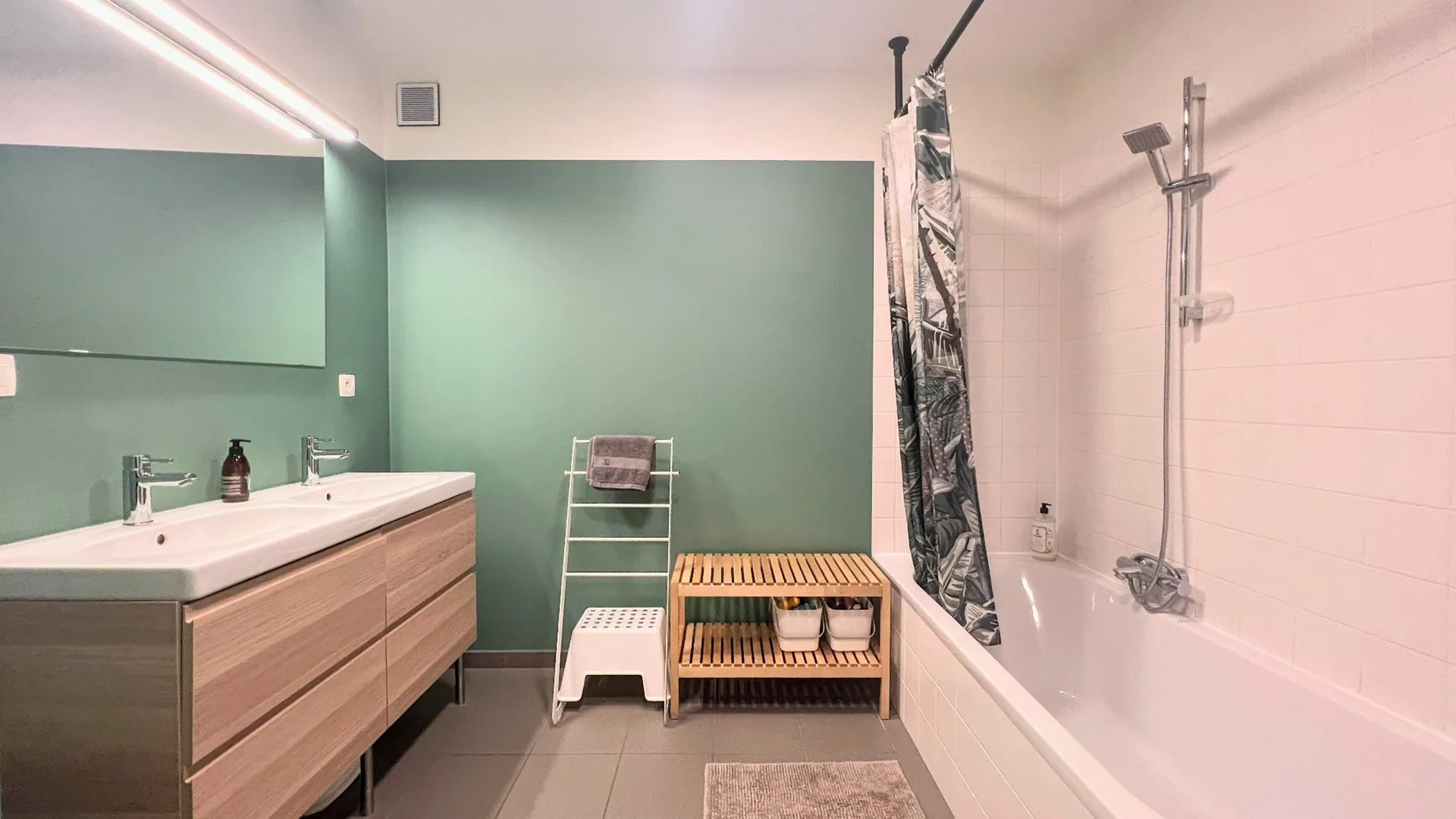Verder zijn er twee ruime slaapkamers van 13 m² en een moderne badkamer met ligbad en lavabomeubel.