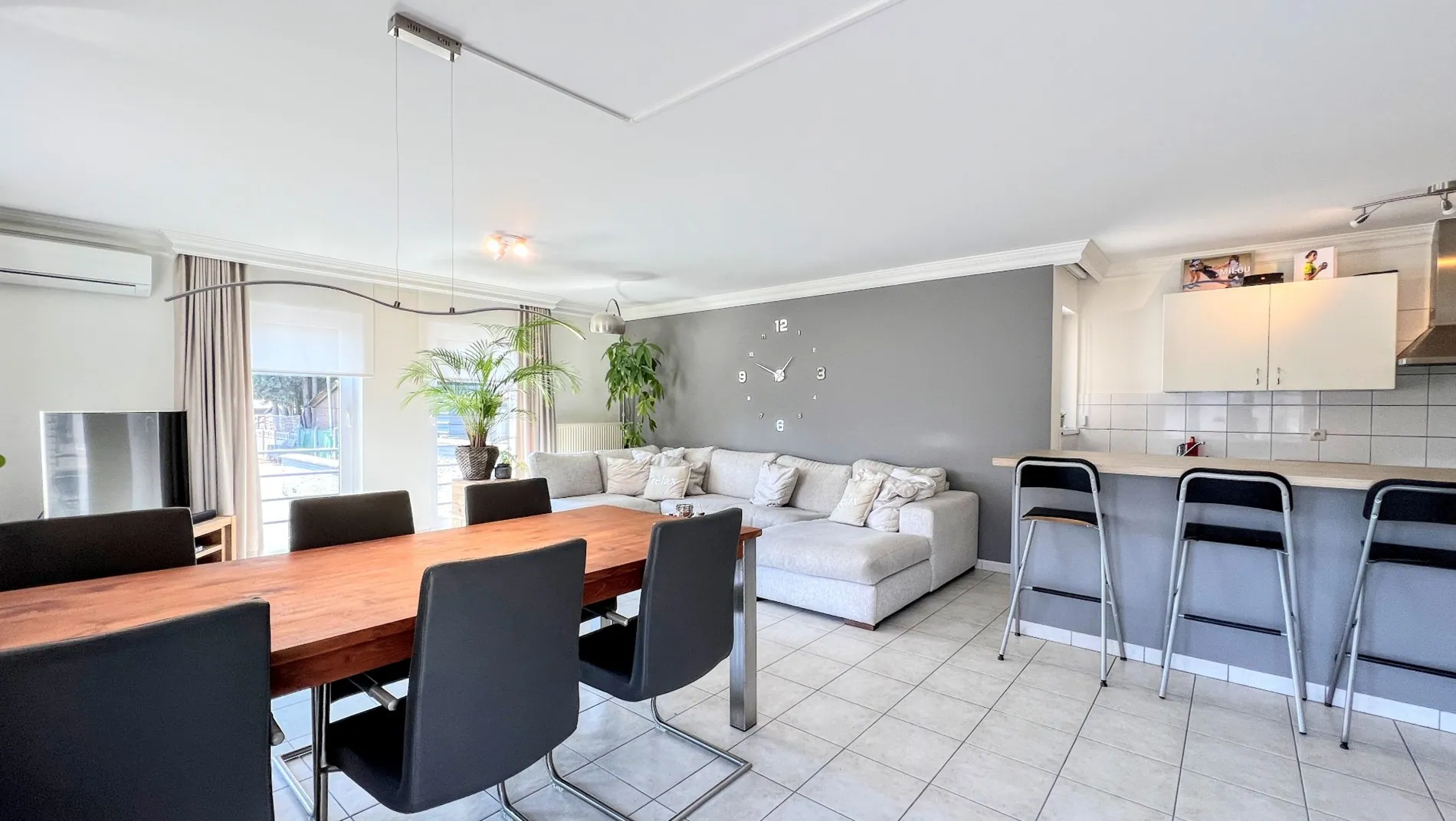 Via de inkomhal met gastentoilet bereik je de leefruimte met open keuken. De keuken met kookeiland is praktisch ingericht. In de leefruimte is er een airconditioning.