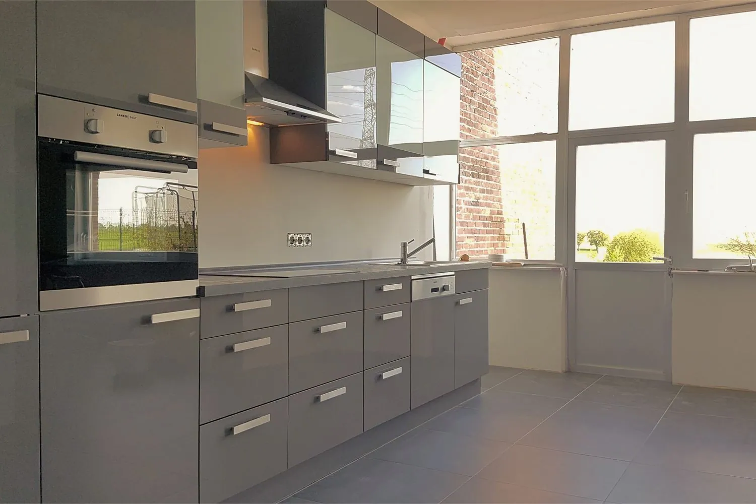 Vanuit de keuken kun je via het balkonterras de achtertuin bereiken. De grote raampartijen zorgen hier voor extra lichtinval en bieden een panoramisch zicht op de achterliggende velden.