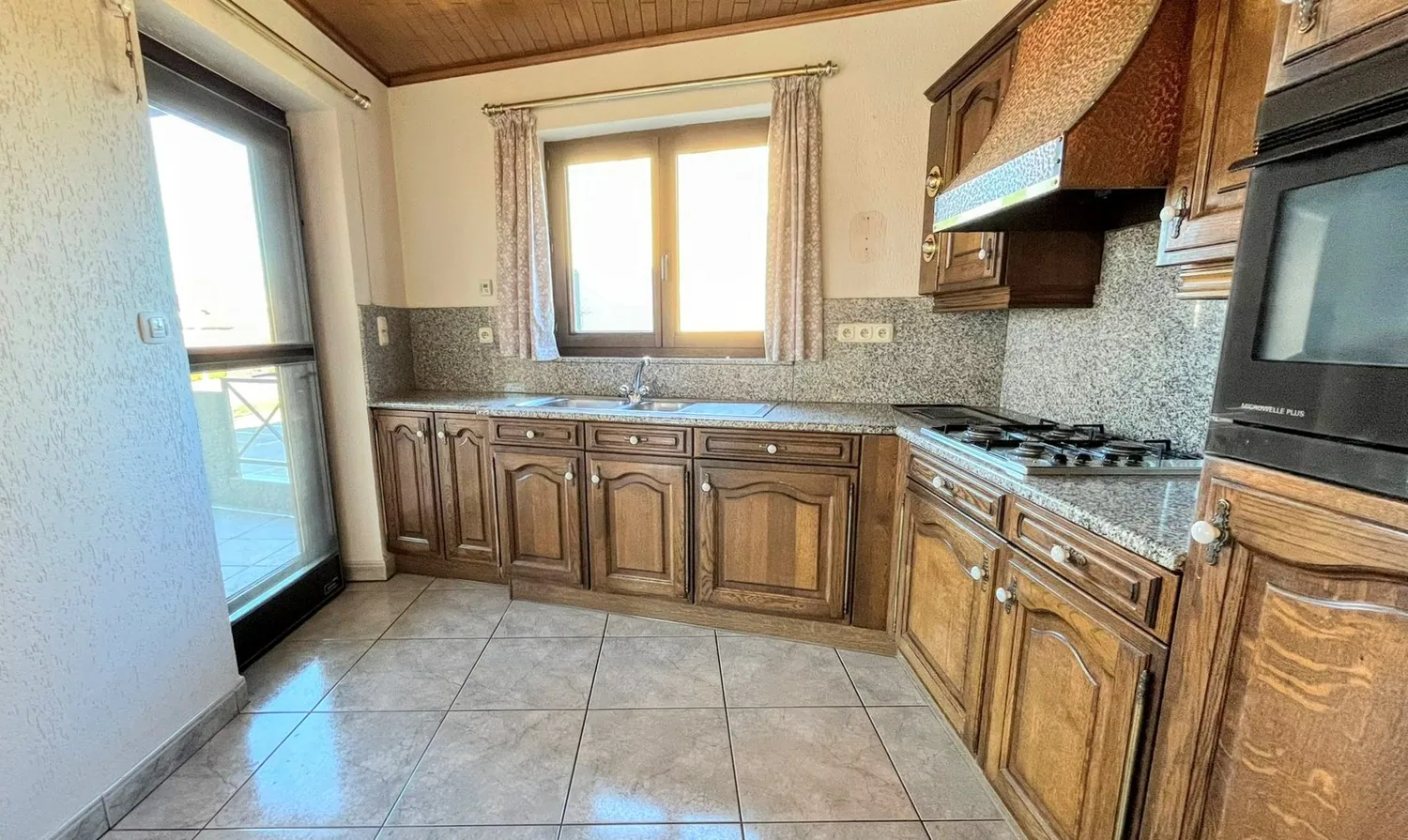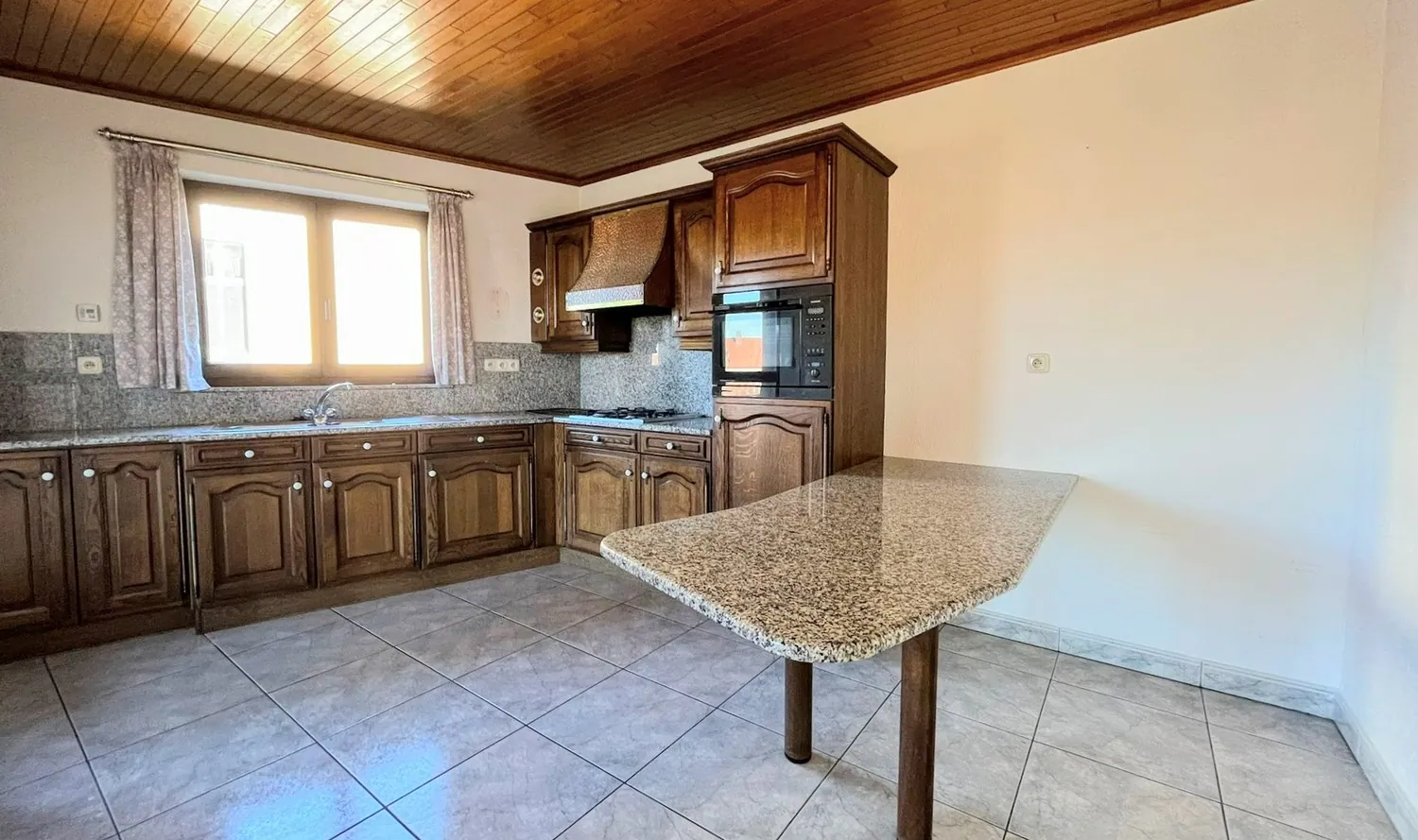 De inkomhal met gastentoilet geeft uit op de royale leefruimte van 43 m², die opgedeeld kan worden in een gezellige zit- en eethoek. De grote schuiframen zorgen voor een natuurlijke lichtinval en geven uit op het overdekte terras. Naastgelegen is er een degelijke keuken met inbouwapparatuur (gasfornuis, combi-oven, spoelbak, dampkap).