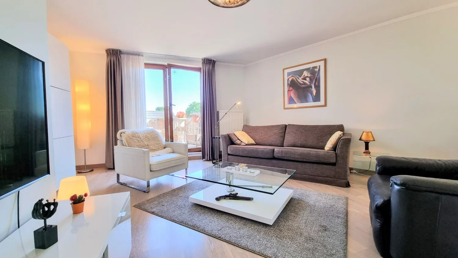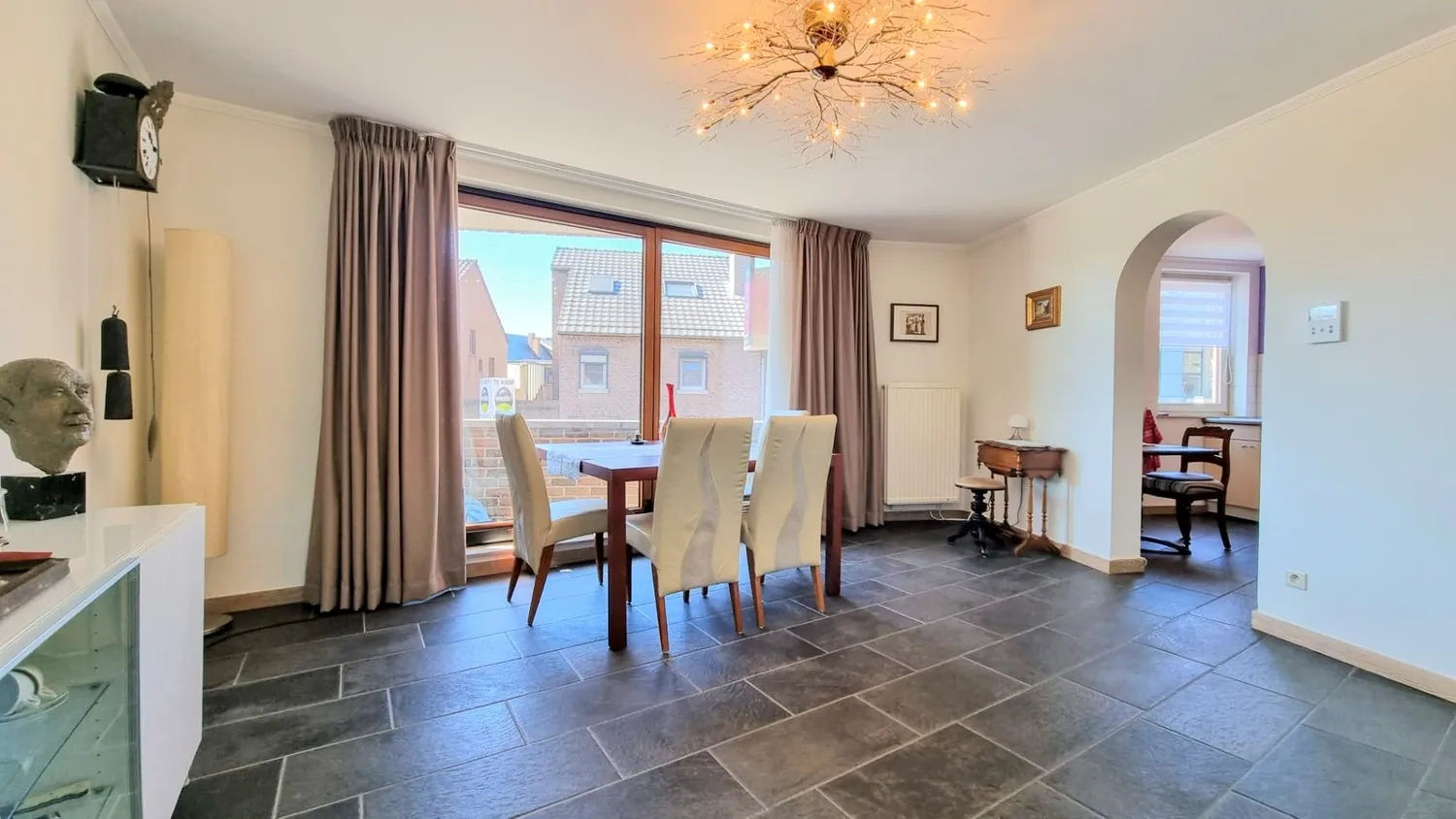 Via de inkomhal met gastentoilet bereik je de royale leefruimte met zit- en eethoek van bijna 55 m². De ruime zithoek geeft uit op een zonnig terras van 9 m². Naastgelegen bevindt zich een moderne keuken met inbouwapparatuur (afwasmachine, keramische kookplaat, oven, koelkast).