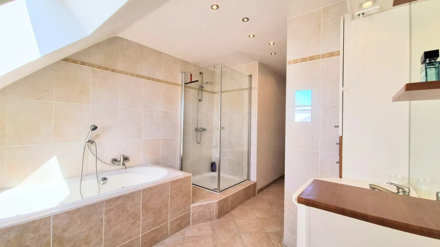 Op de eerste etage geeft de nachthal met toilet uit op twee ruime slaapkamers van 21 en 22 m² en een badkamer. De badkamer is uitgerust met een ligbad, douche en lavabomeubel.