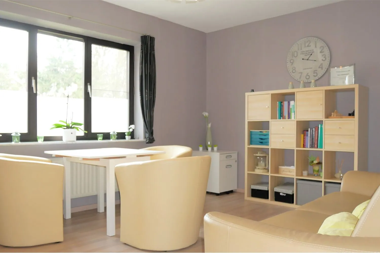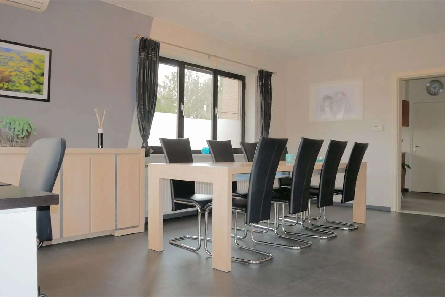 De leefruimte in L-vorm heeft een oppervlakte van 42m² en is ingedeeld in een eetkamer en zithoek. De mooie lichtinval via de grote ramen zorgt hier voor een warm en landelijk gevoel.