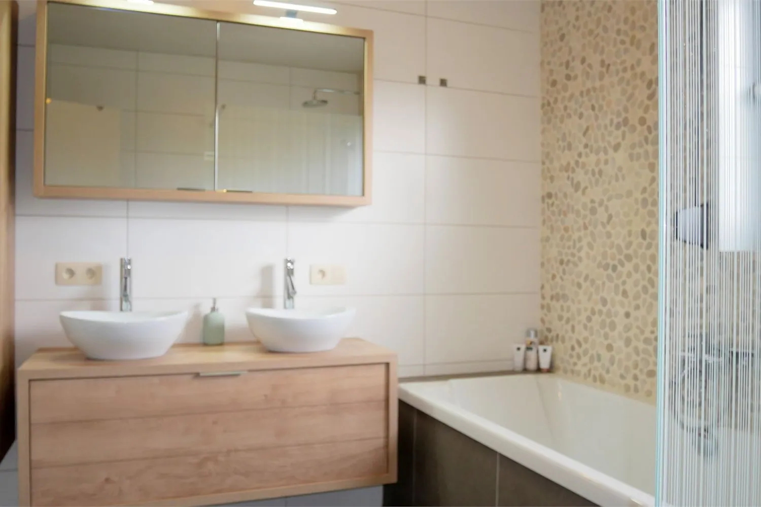 De badkamer heeft recent een totaalrenovatie ondergaan. Hier is er een inloopdouche met regendouche; een ligbad; een dubbele lavabo en een ophangtoilet.