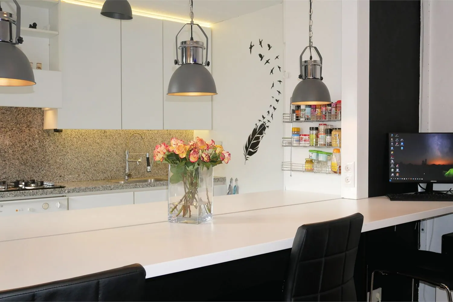 De keuken met ziteiland is voorzien van ingerichte keukenapparatuur met gasfornuis en dampkap, spoelbak, inbouwoven en vaatwasser. Naastgelegen is er een praktische berging. Deze is eveneens bereikbaar via een aparte toegangsdeur.