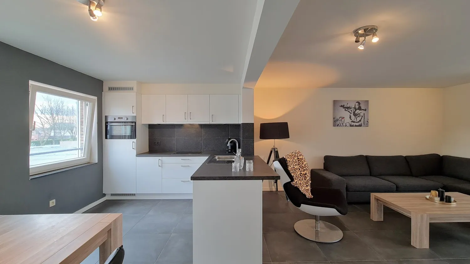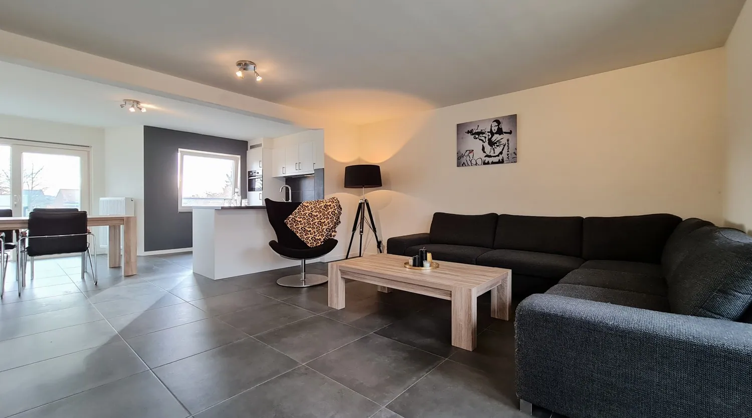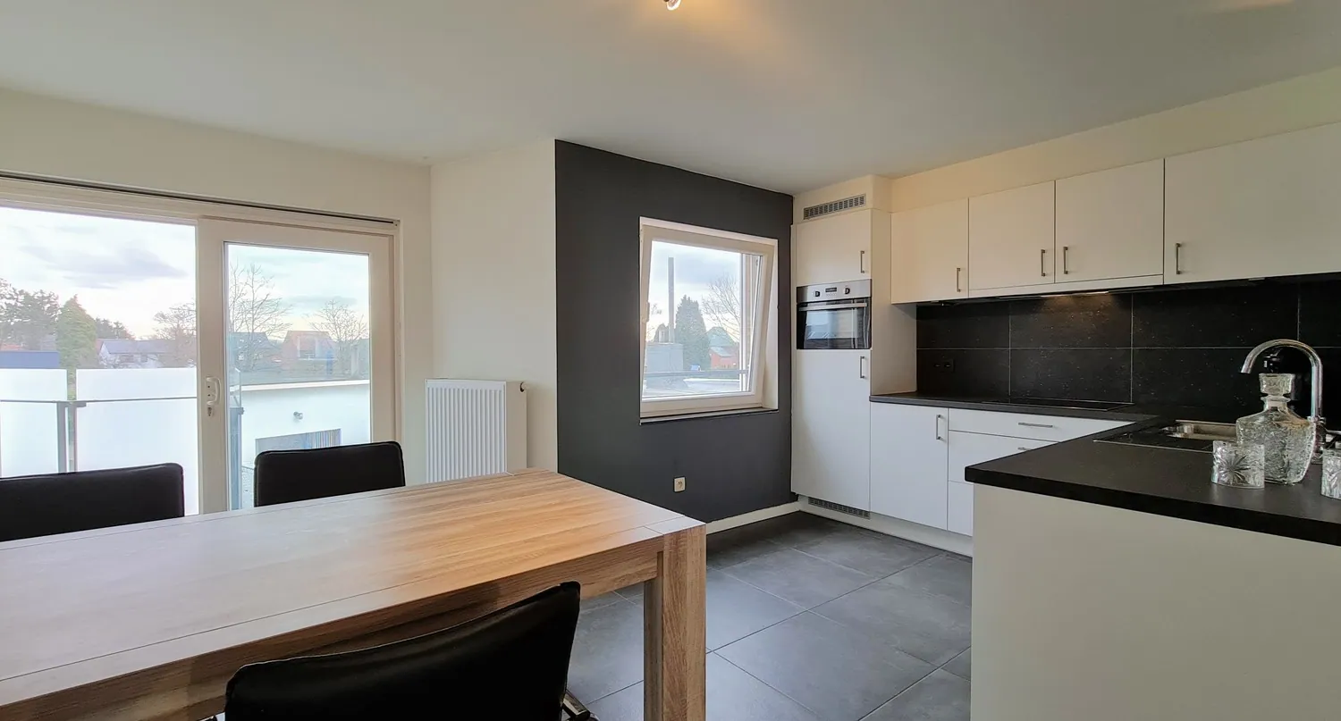 In de open keuken is er degelijke inbouwapparatuur voorzien (vaatwasser, combi-oven en keramische fornuis met dampkap). Via de schuifpui kom je uit op het zonneterras van 10 m².