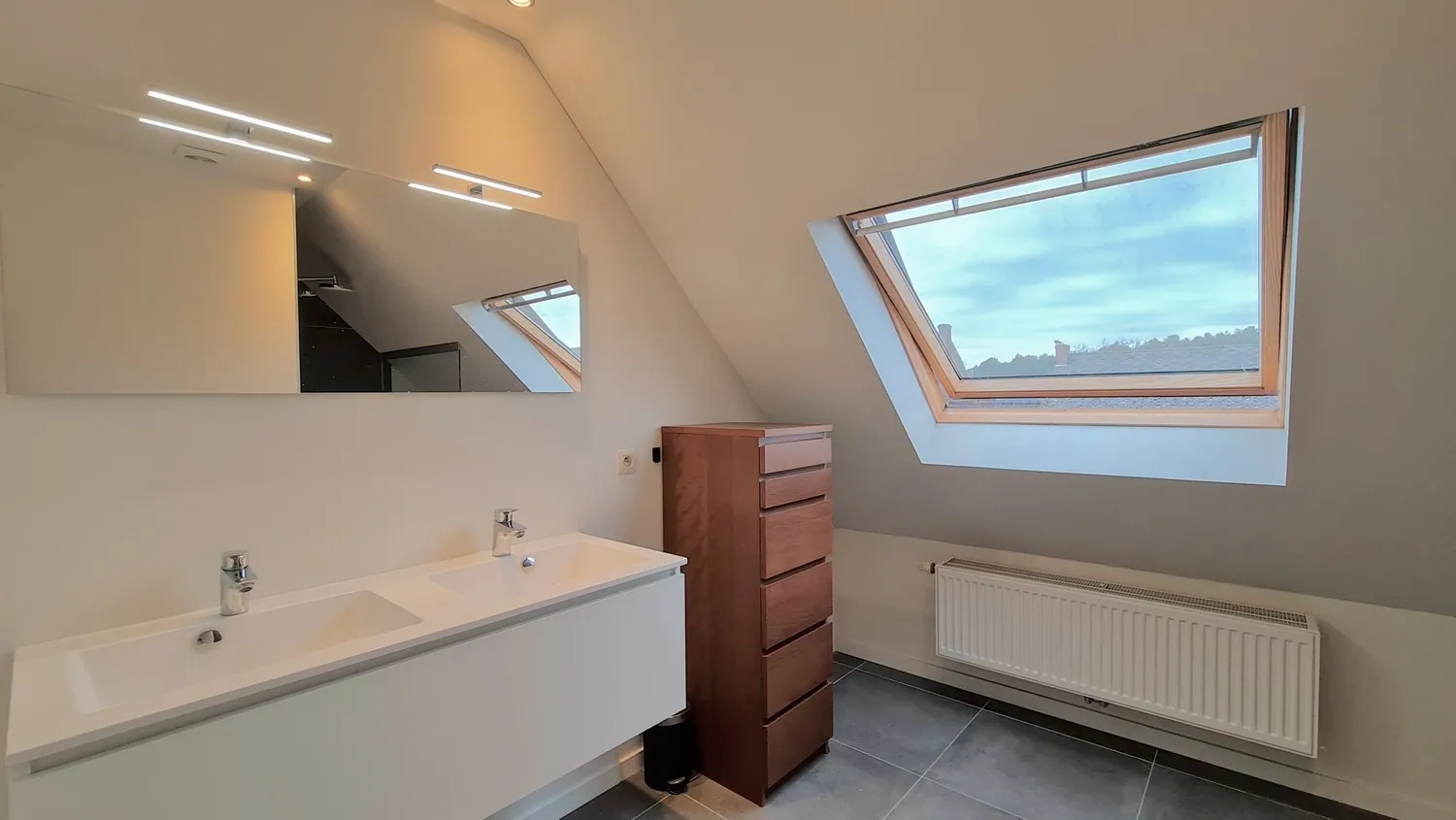 Op de eerste etage geeft de nachthal uit op een ... afzonderlijk toilet, een ruime badkamer en 2 slaapkamers. Deze hebben een oppervlakte van 15 m² en 12 m². De ingerichte badkamer is voorzien van een badkamermeubel met dubbele lavabo en een inloopdouche.