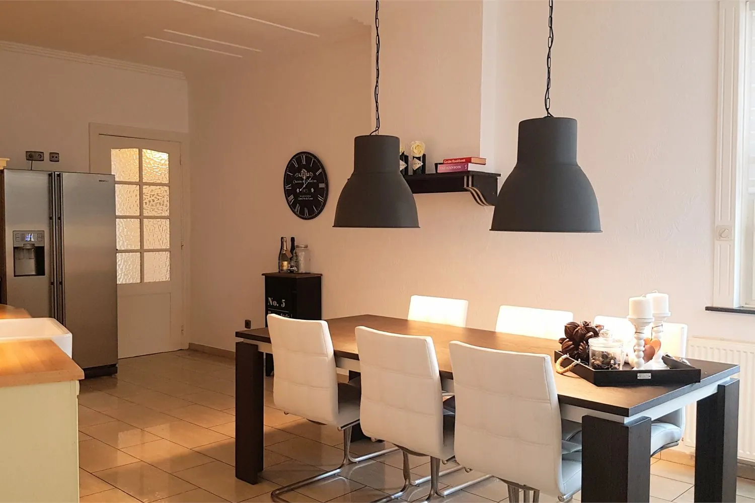 In de leefruimte van 40 m² worden zithoek en eetkamer van elkaar gescheiden door een authentiek houten deurkader met geslepen glas. De zithoek heeft een gezellige gashaard aan de sierschouw.