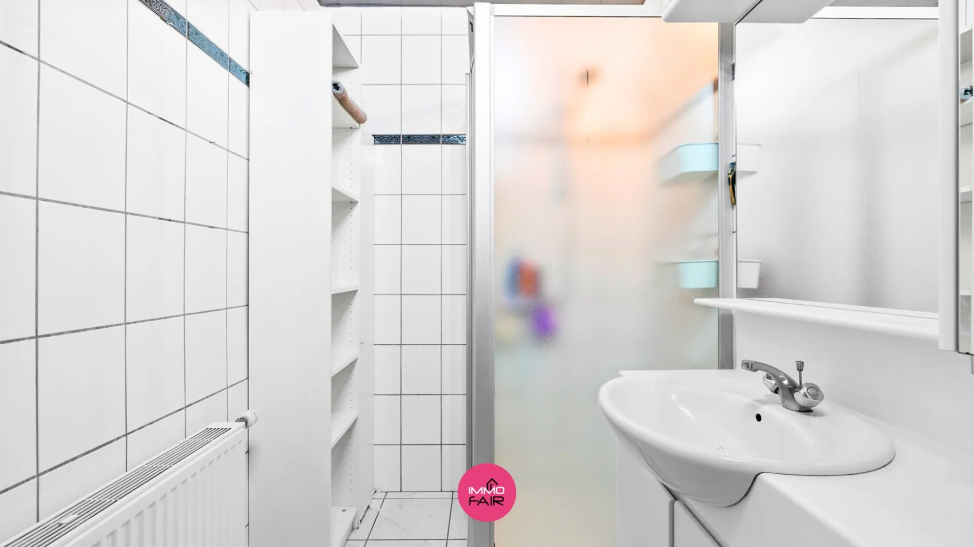 De private inkomhal met ingebouwde vestiairekast geeft toegang tot drie slaapkamers van 15, 13 en 7 m², een gastentoilet en een badkamer. De badkamer is uitgerust met een douchecabine en een lavabomeubel.