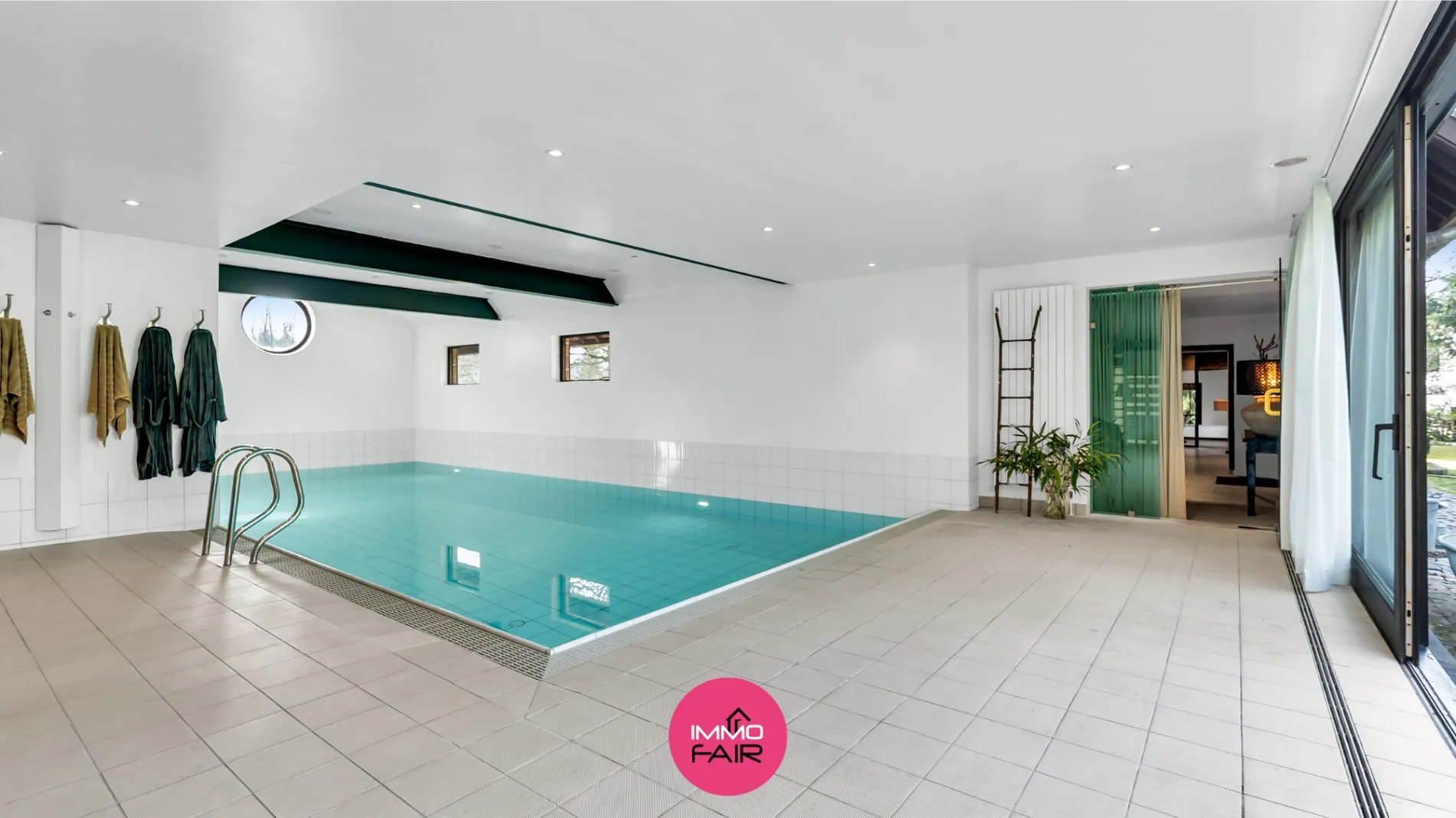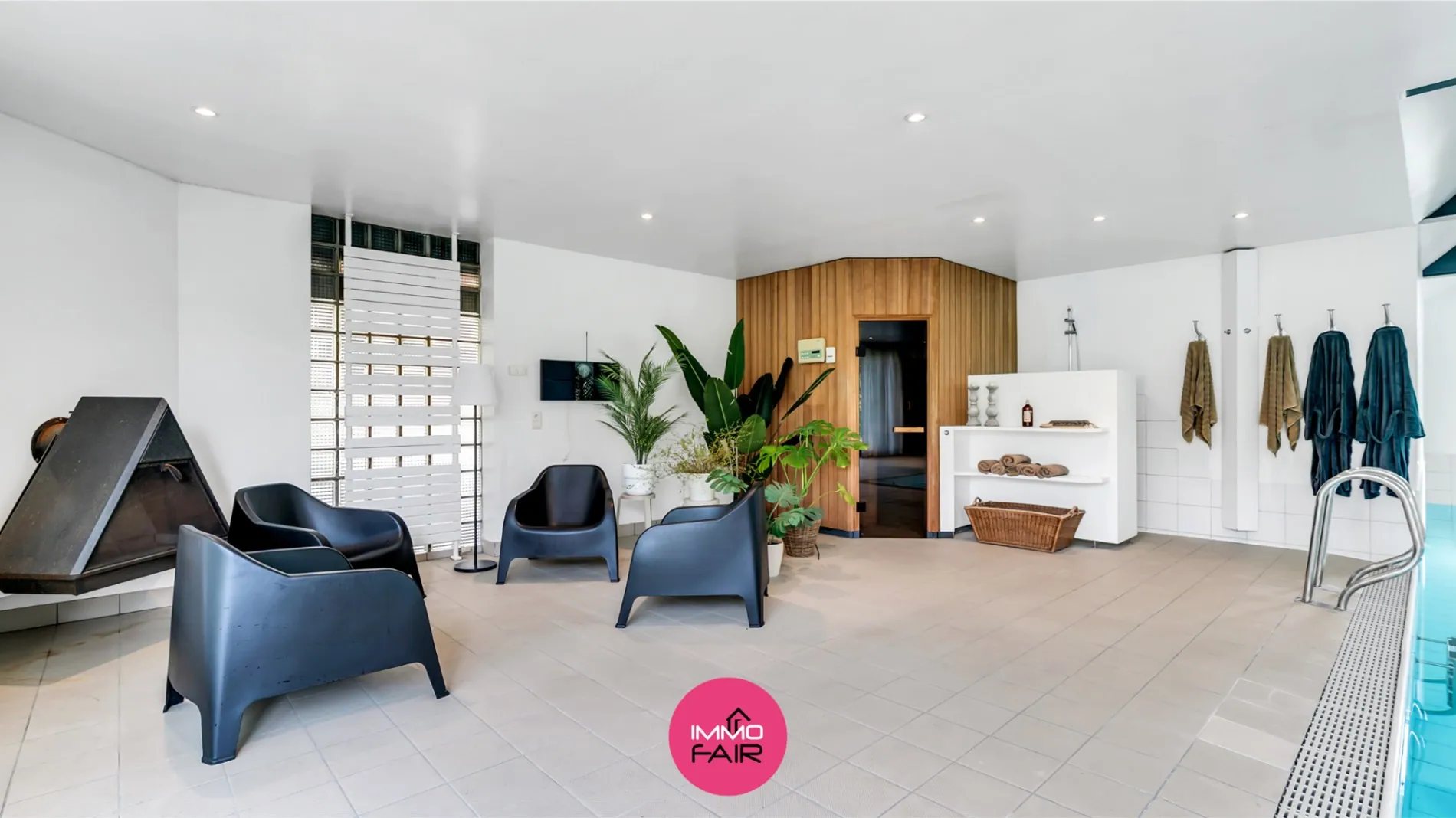 Daarnaast beschikt de woning over een exclusieve wellnessruimte met binnenzwembad en sauna. Dankzij de kamerbrede schuifpui staat deze ontspanningsruimte in directe verbinding met de tuin, waardoor een bijzonder aangename en open sfeer ontstaat.