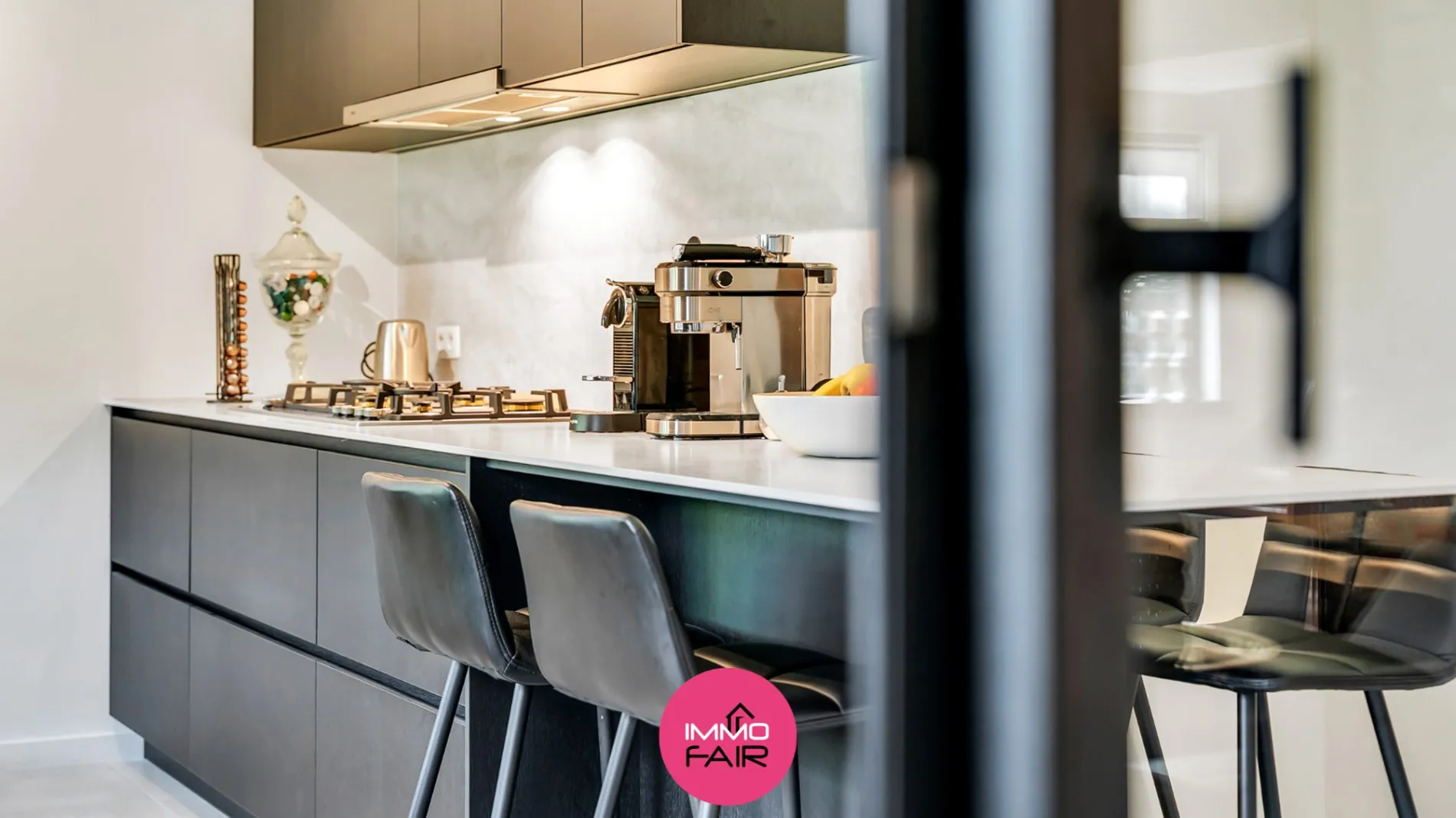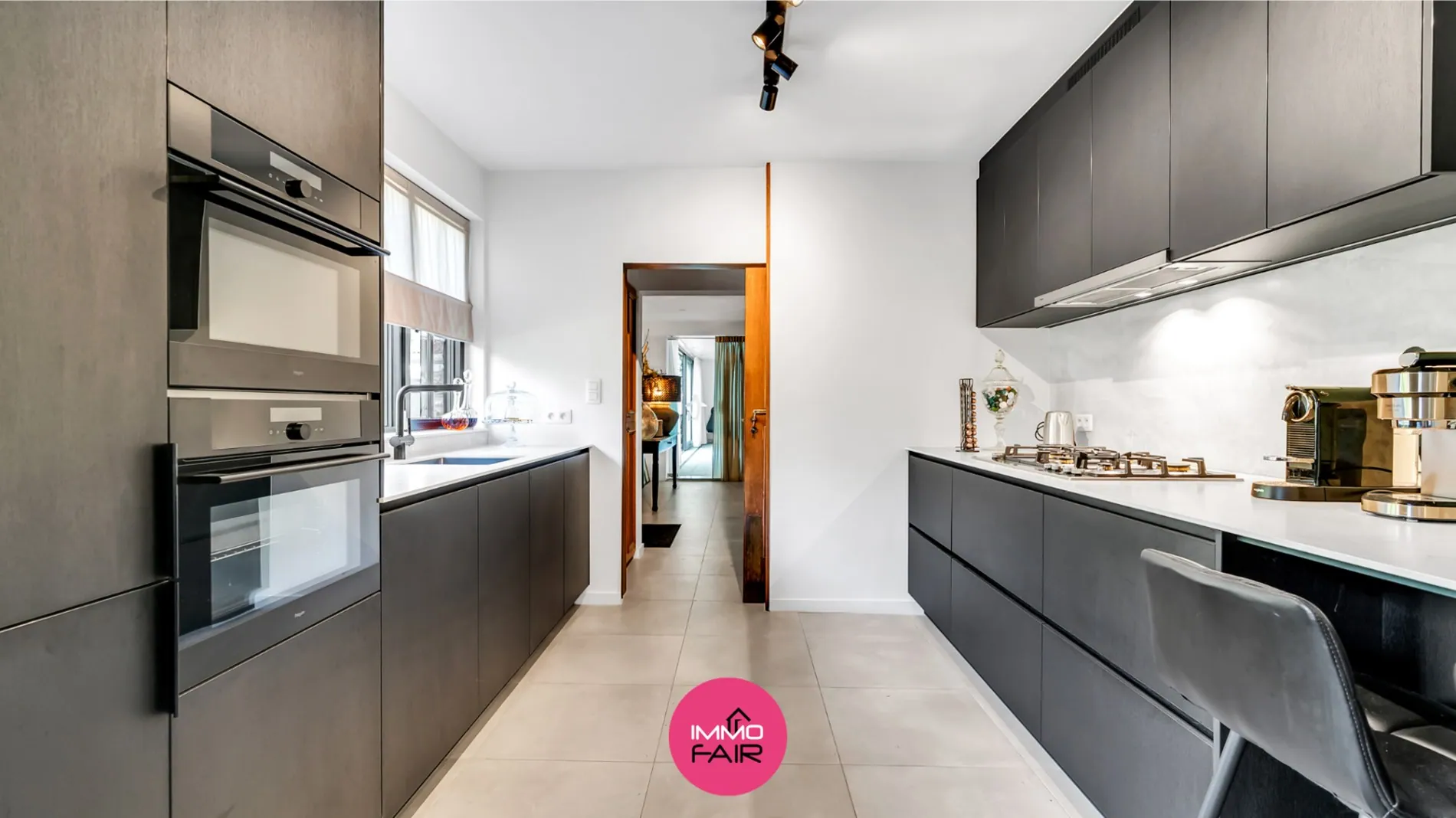 Aansluitend bevindt zich de moderne keuken, volledig uitgerust met hoogwaardige inbouwtoestellen en alle hedendaagse comfort. Vanuit de keuken heb je directe toegang tot de tuin, waardoor binnen en buiten op natuurlijke wijze met elkaar verbonden worden.