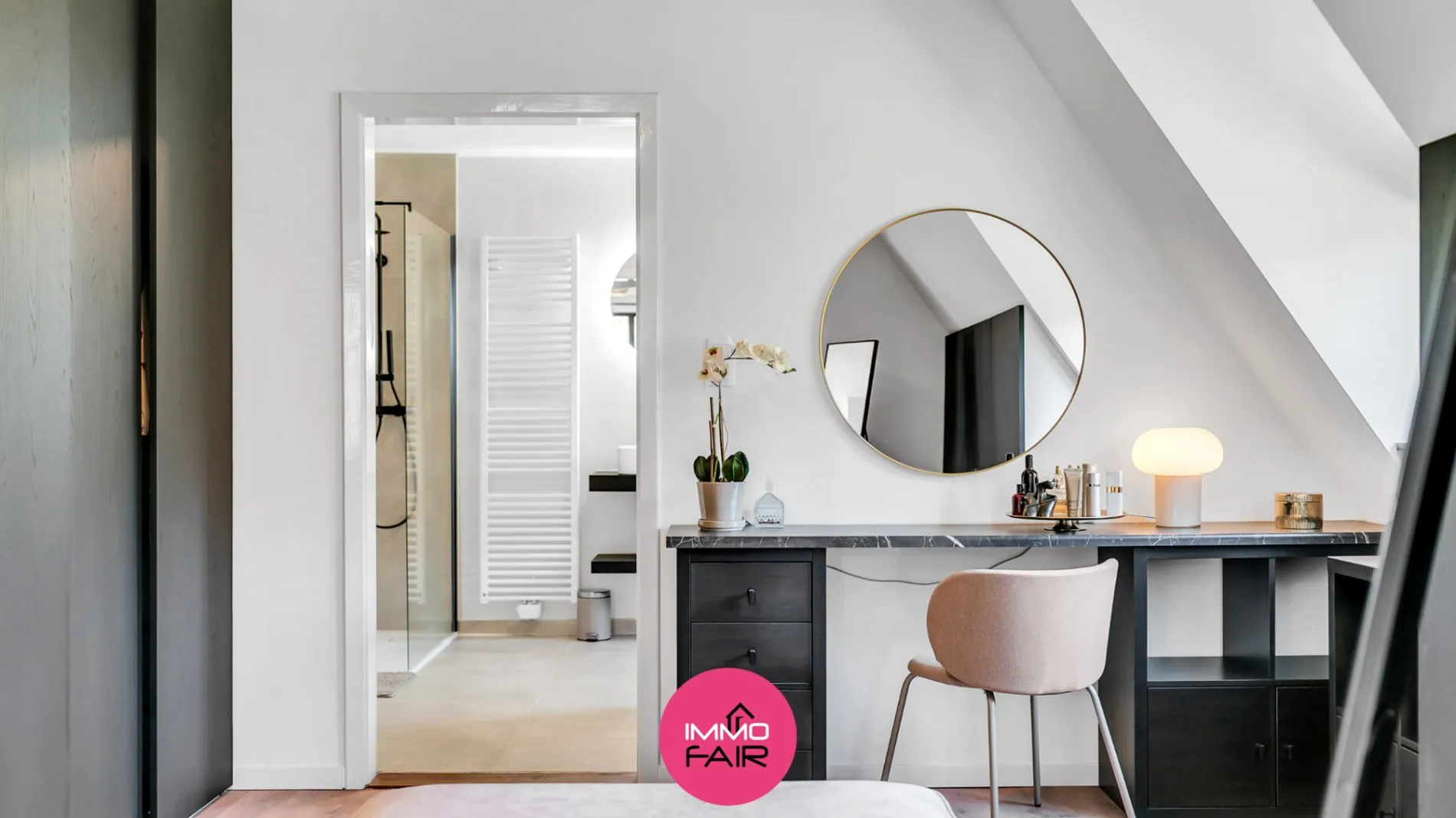 Op deze etage bevinden zich twee royale slaapkamers. De master bedroom beschikt over een stijlvolle dressing met maatkasten en een en-suite badkamer, uitgerust met een ligbad, een inloopdouche en een dubbele lavabo. Ook de tweede slaapkamer geniet van een eigen en-suite badkamer met inloopdouche en dubbele lavabo.