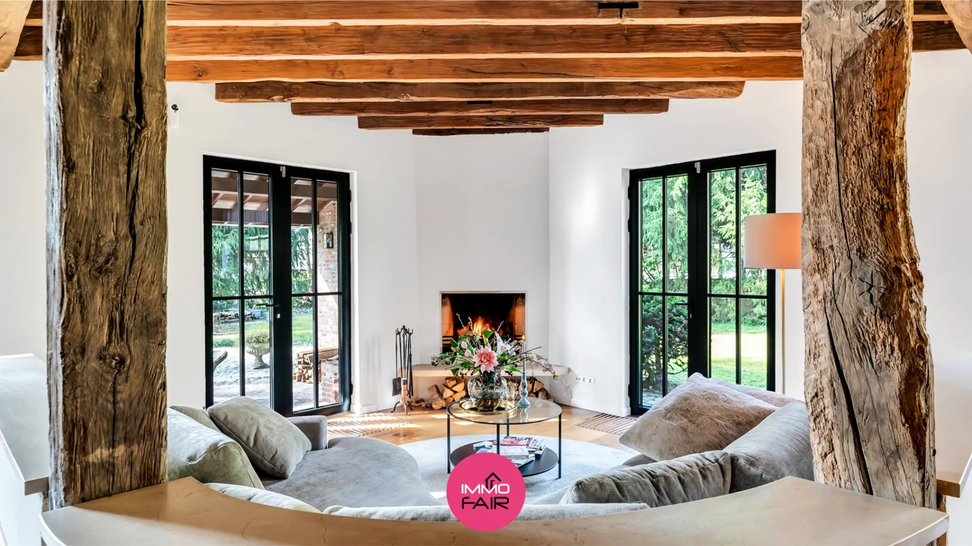 Via de imposante houten inkomdeur betreed je de royale inkomhal met open vide, waar het warme en authentieke karakter van de woning meteen tot zijn recht komt. Een elegante, zwartmetalen glazen deur leidt naar de sfeervolle leefruimte en eetkamer. Grote raampartijen zorgen hier ... voor een overvloed aan natuurlijk licht, met centraal de stijlvolle open haard die zorgt voor warmte en een huiselijke sfeer.