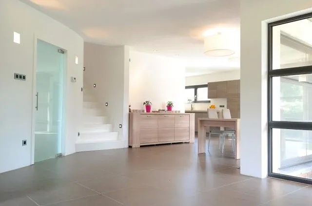 De wand die deze ruimte van de inkomhal scheidt, is in lichte boogvorm en geeft zo het strakke interieur een speelse toets.