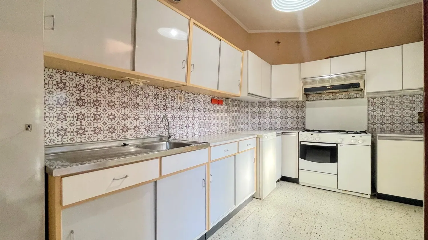Via de inkomhal bereik je aan de linkerzijde de royale leefruimte met gezellige schouwmantel. Aansluitend is er een ruimte eetkamer van 16 m². Naastgelegen is er een eenvoudige, te renoveren keuken die uitgeeft op het achterste gedeelte van de woning. Hier bevindt zich een kleine berging en toilet. Nog verder naar achteren is er een ruime berging/bijkeuken en garage.