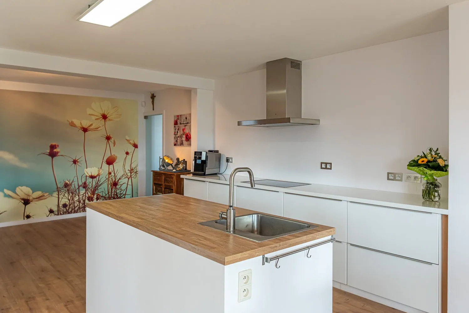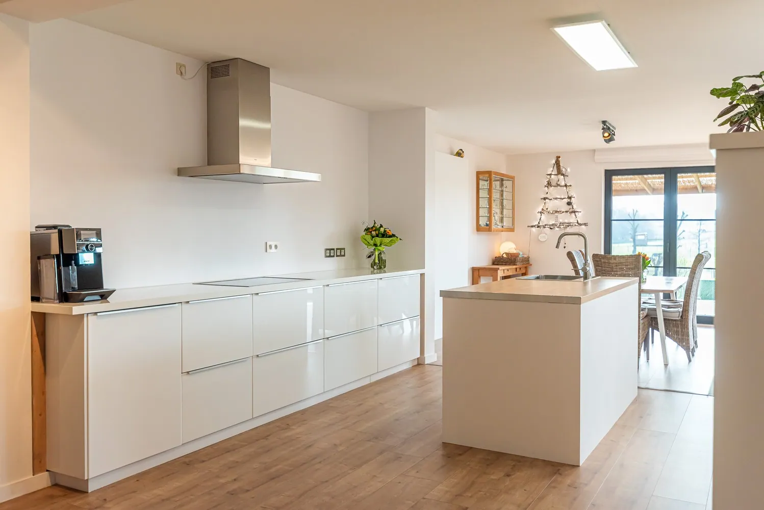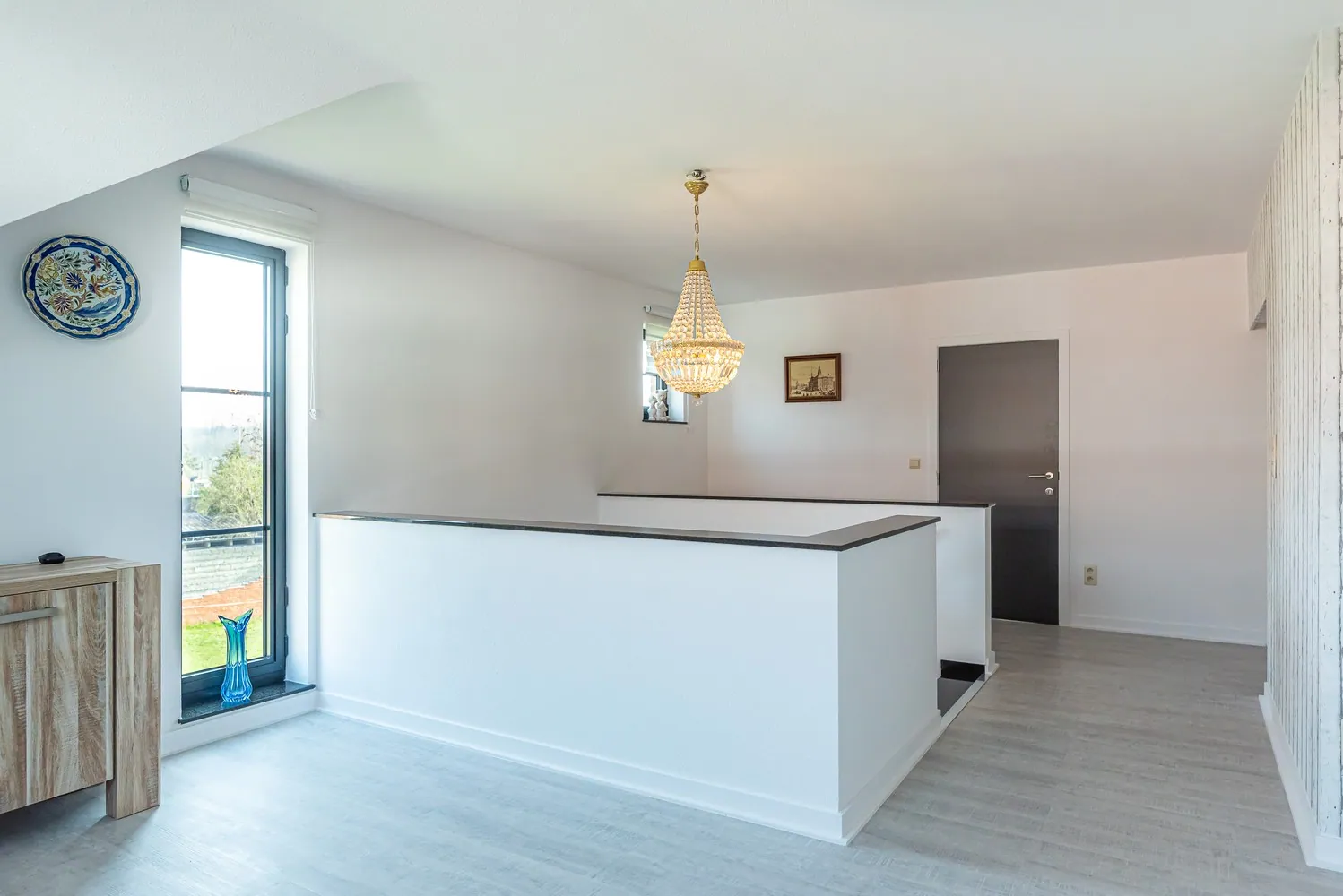 In de open keuken met kookeiland is er degelijke inbouwapparatuur voorzien (inductievuur, koelkast, vaatwasser).