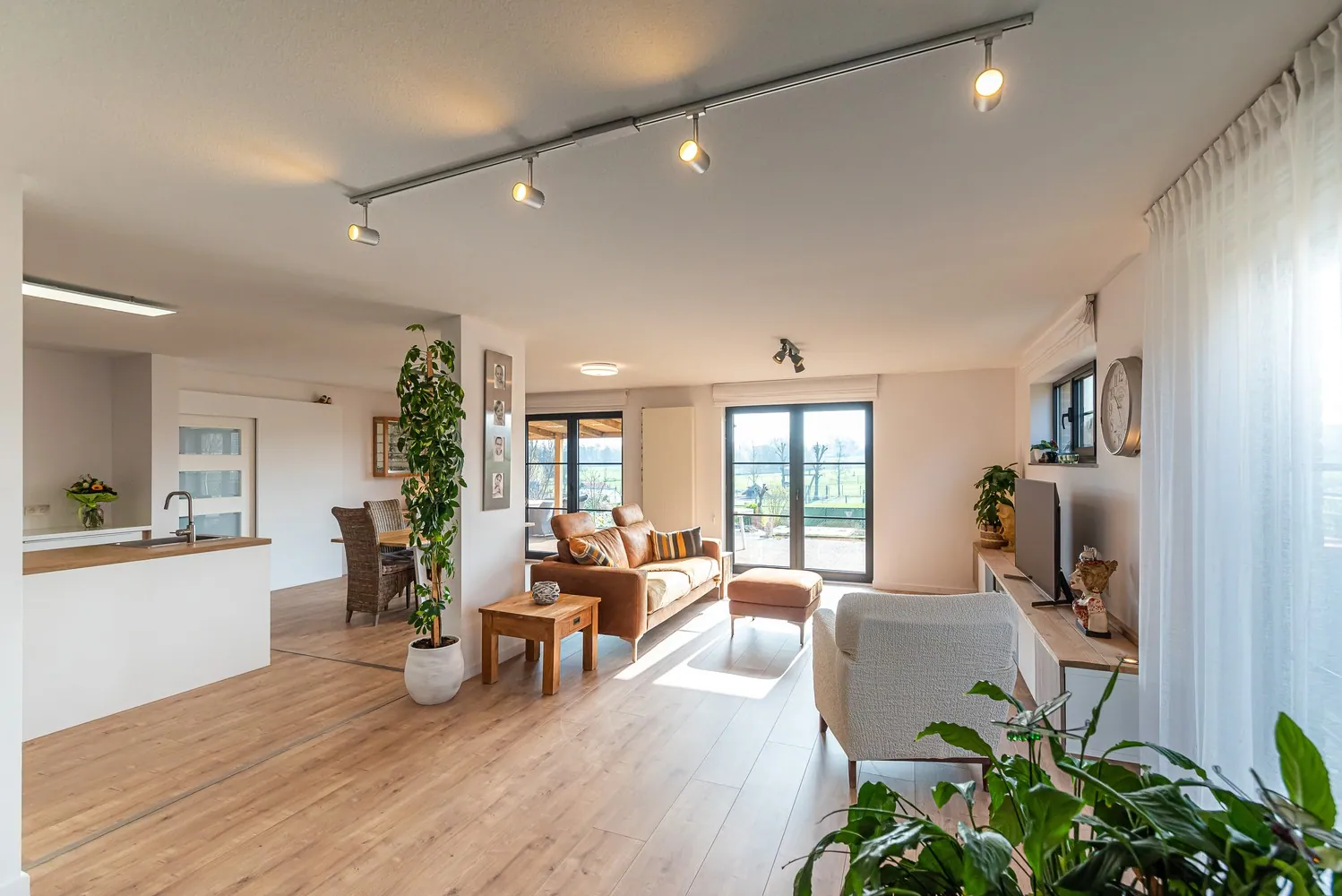 De brede raampartijen zorgen voor een lichtrijk interieur en geven een open zicht op het terras, de achtertuin en de achtergelegen velden.