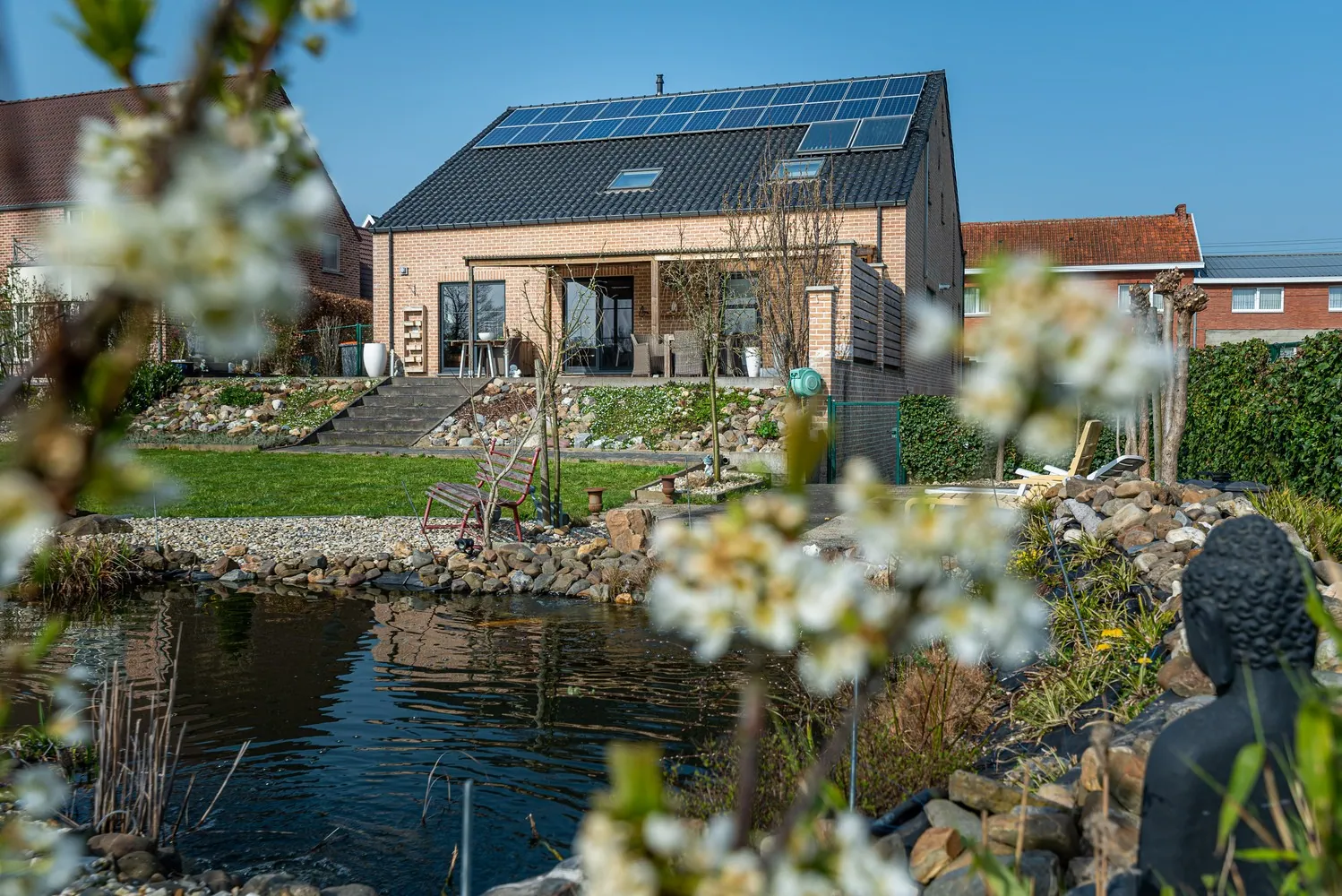 De riante, zuidoost-gerichte achtertuin is volledig omheind: hier geniet je van alle privacy. Het terras is beklinkerd en deels overdekt. Hier geniet je van het uitzicht op de visvijver en de achterliggende velden.