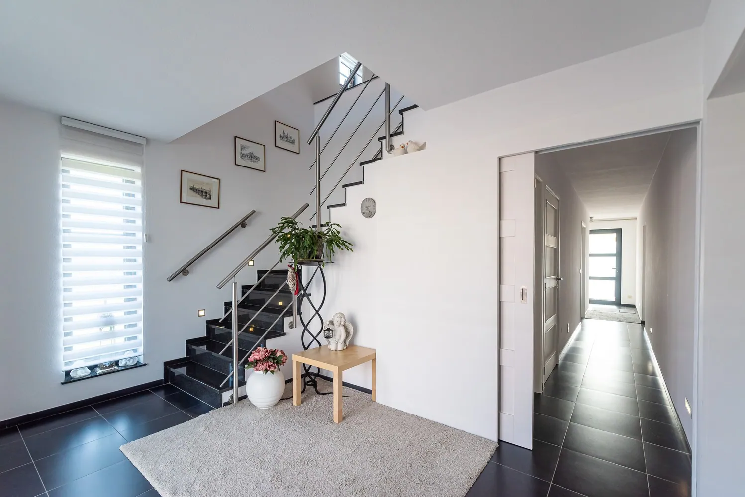 Op de benedenverdieping geeft de riante inkomhal met vestiairehoek uit op een afzonderlijke praktijkruimte en op de woonvertrekken.