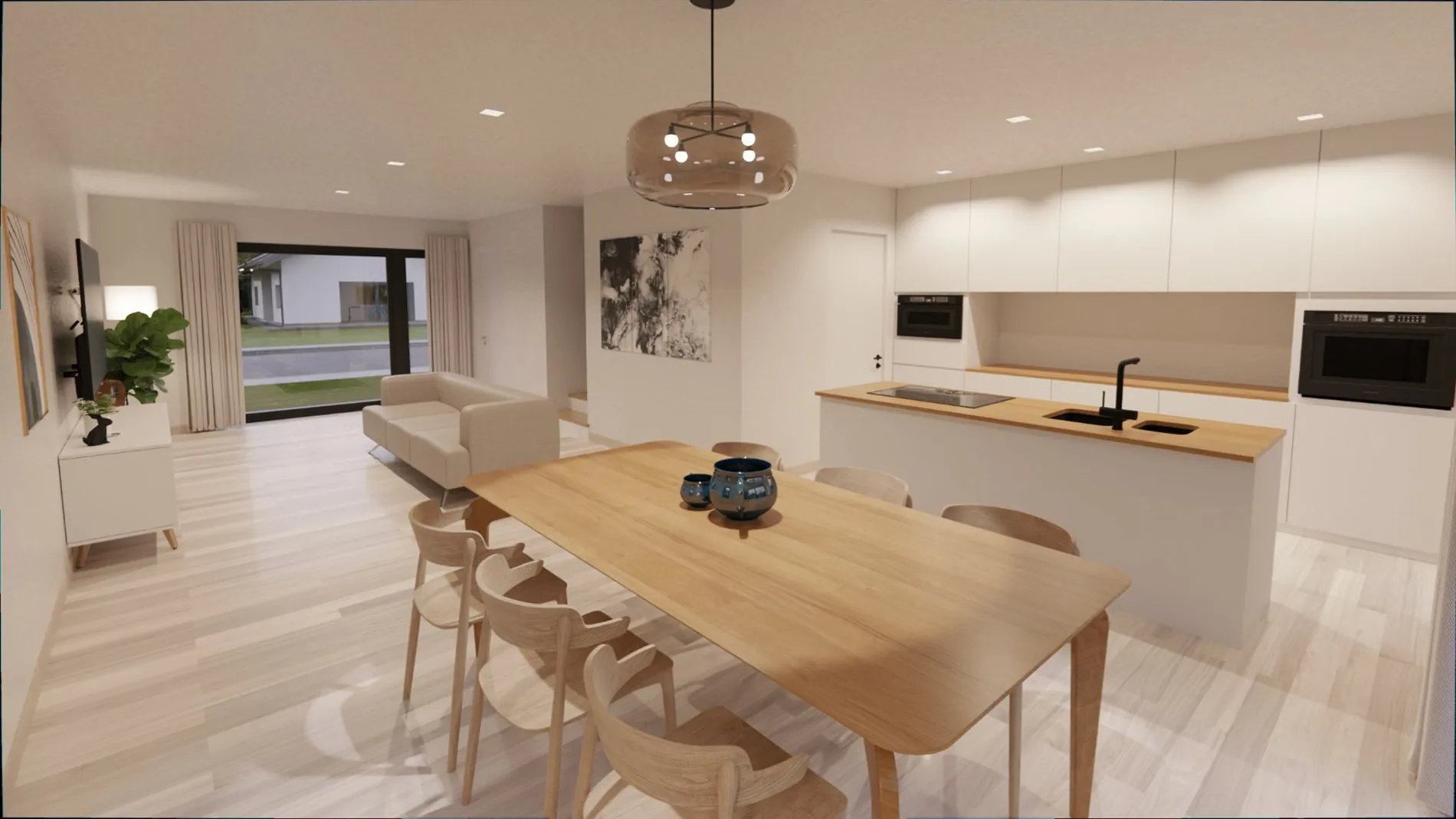 Via de inkomhal met gastentoilet heb je toegang tot de ruime leefruimte met open keuken. Naast de keuken is er een praktische bergruimte. Via het royale schuifraam in de leefruimte bereik je het terras en de tuin.