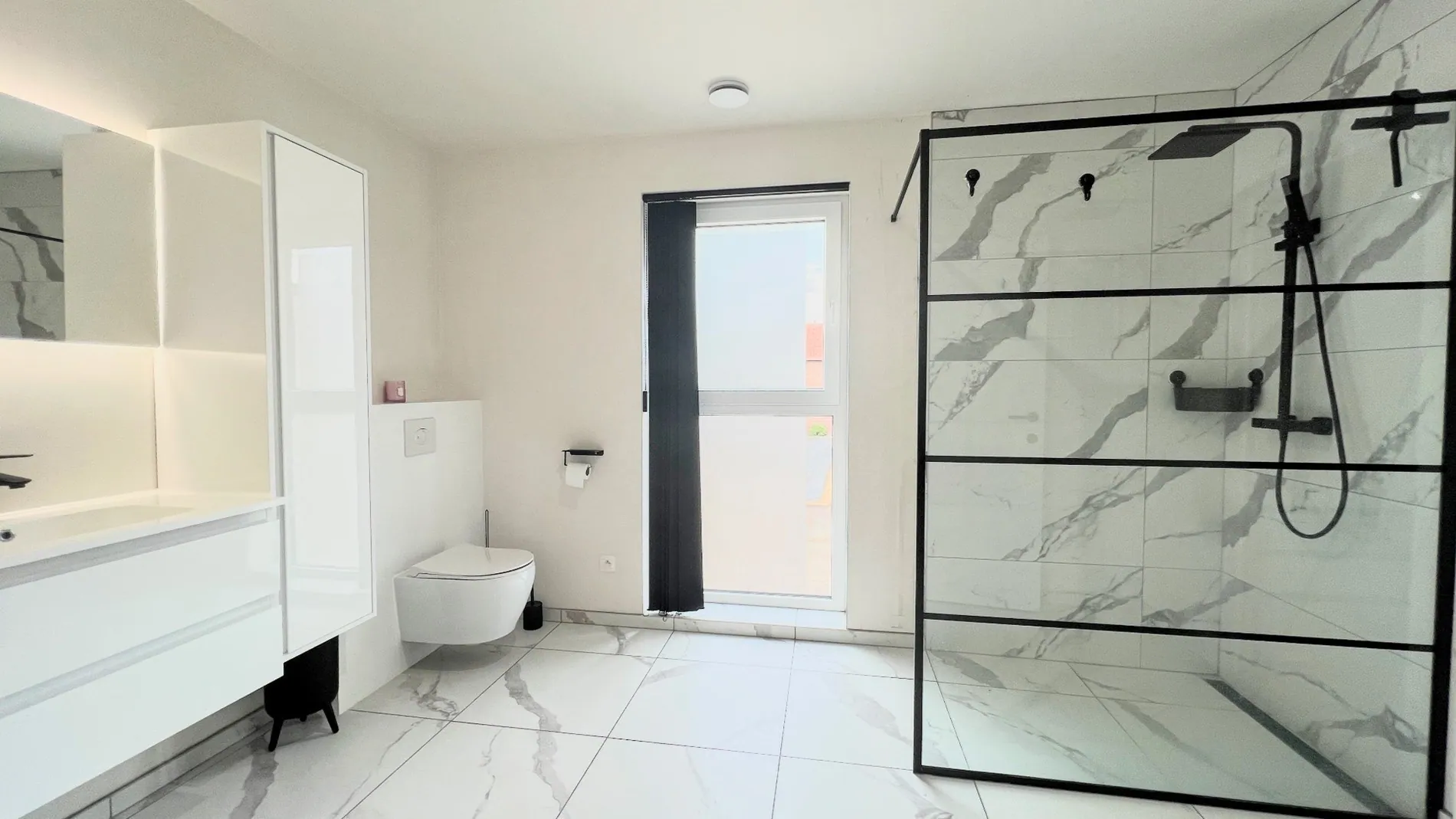 De nachthal op de eerste etage geeft uit op drie slaapkamers van crica 11, 11 en 9 m² en de badkamer. De badkamer is uitgerust met een nachttoilet, inloopdouche en lavabomeubel. Vanuit de badkamer heb je toegang tot een praktische opbergruimte met inbouwkasten.