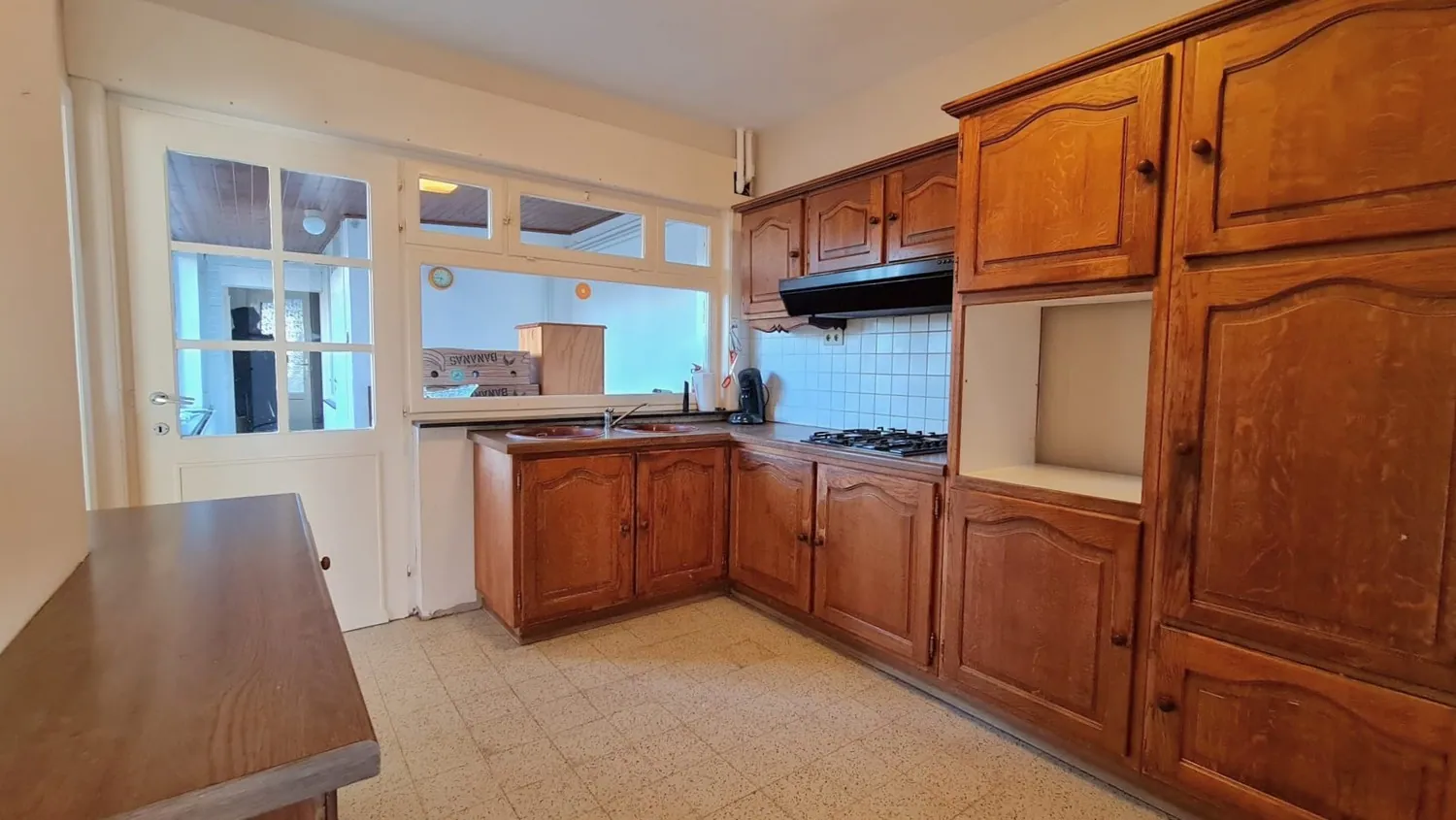 Via de inkomhal bereik je de leefruimte en keuken. De leefruimte met authentieke houtkachel is praktisch ingedeeld met een zit- en eethoek. De eethoek geeft toegang tot de naastgelegen keuken die is uitgerust met een gasvuur, dampkap en dubbele spoelbak.