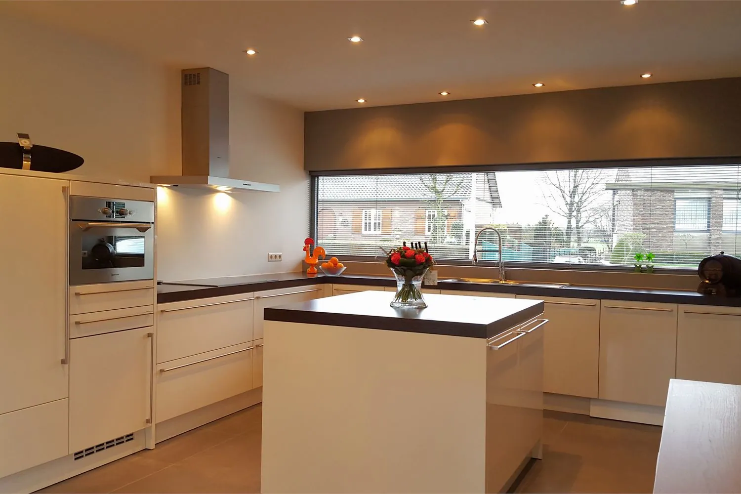 De ruime keuken met eiland is uitgerust met hoogwaardige keukenapparatuur (waaronder combi-oven met steamer, vaatwasser, koelkast, inox spoelbak en keramisch fornuis). Naastgelegen is er een praktische bergruimte met aansluiting voor wasmachine en droogkast. Hier ... is de hoogrendementsketel op aardgas (Viessmann) geïnstalleerd.