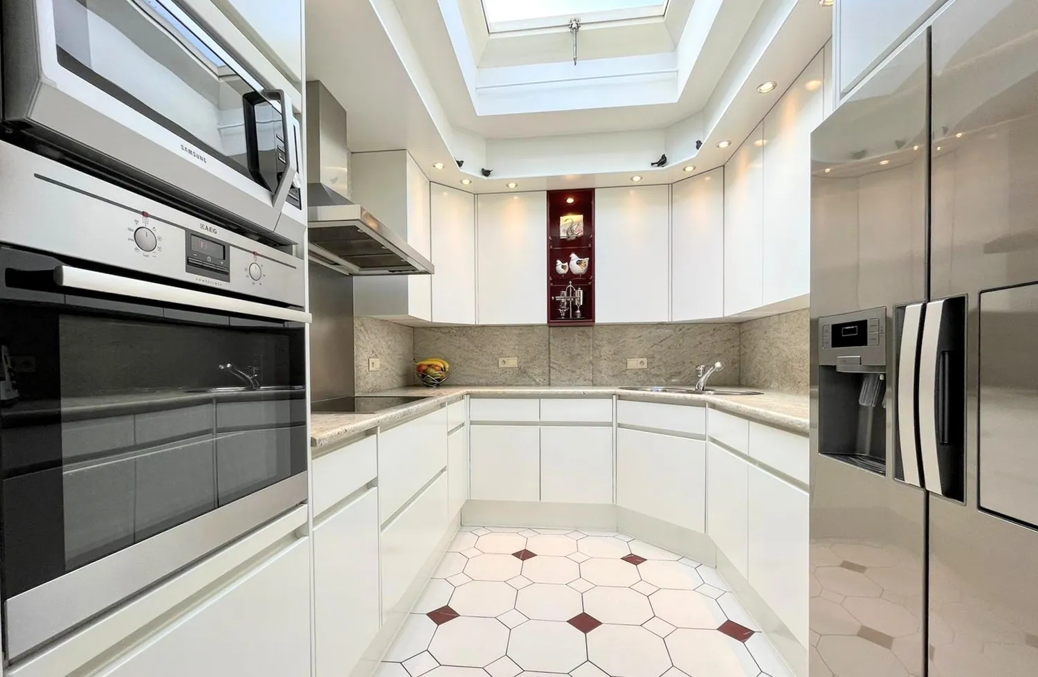 Aansluitend aan de leefruimte is er de keuken. De keuken met eethoek is voorzien van inbouwapparatuur: Amerikaanse koelkast van Samsung, inductiekookplaat, oven, magnetron en spoelbak. Naastgelegen is er een berging met aansluiting voor ... droogkast en wasmachine en maatkasten, ideaal als extra opbergruimte en voorraadkast.