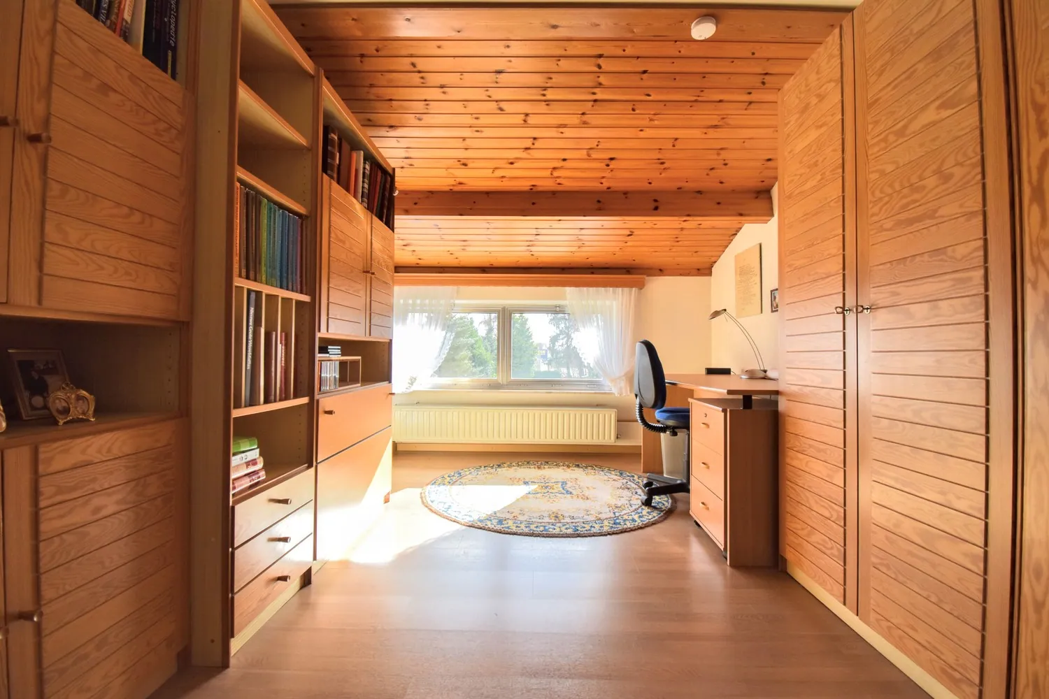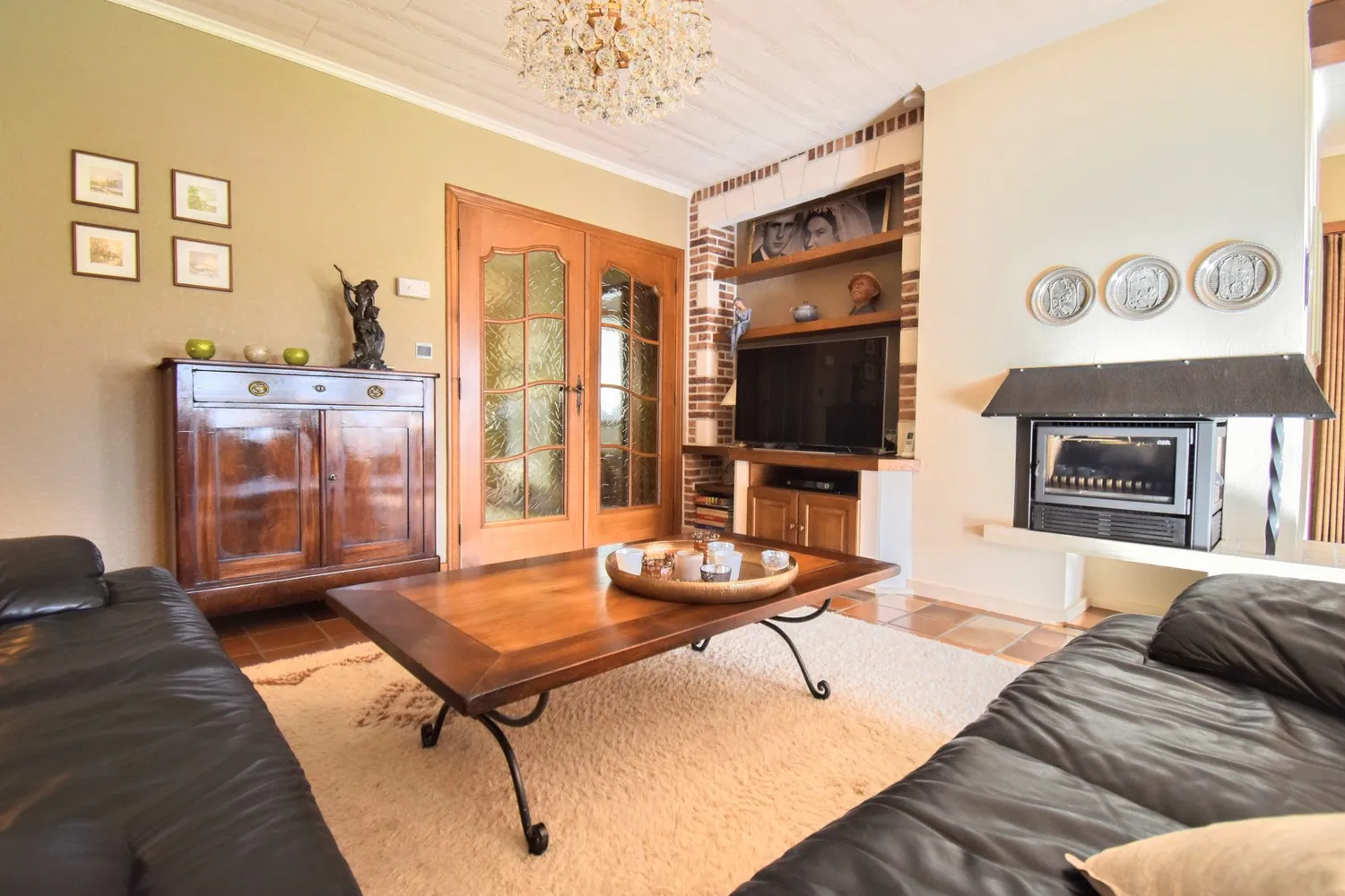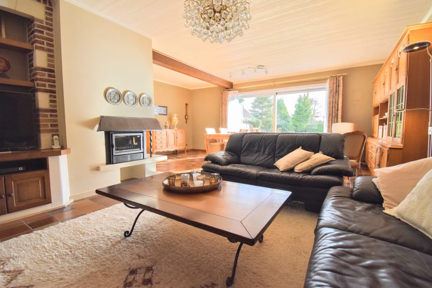 Via de inkomhal met gastentoilet bereik je een lichtrijke leefruimte in L-vorm, ingedeeld als eet- en zithoek. Centraal in de leefruimte bevindt zich een gezellige inbouwhaard. De grote ramen zorgen voor veel lichtinval en er is een aangenaam contact met het aansluitend terras en de royale achtertuin. Naastgelegen is er een praktische keuken voorzien van inbouwapparatuur (koelkast, spoelbak, keramische kookplaat, dampkap & oven). De naastgelegen kamer is momenteel ingericht als extra bergruimte, maar deze kan ook ... perfect dienen als afzonderlijk bureau.