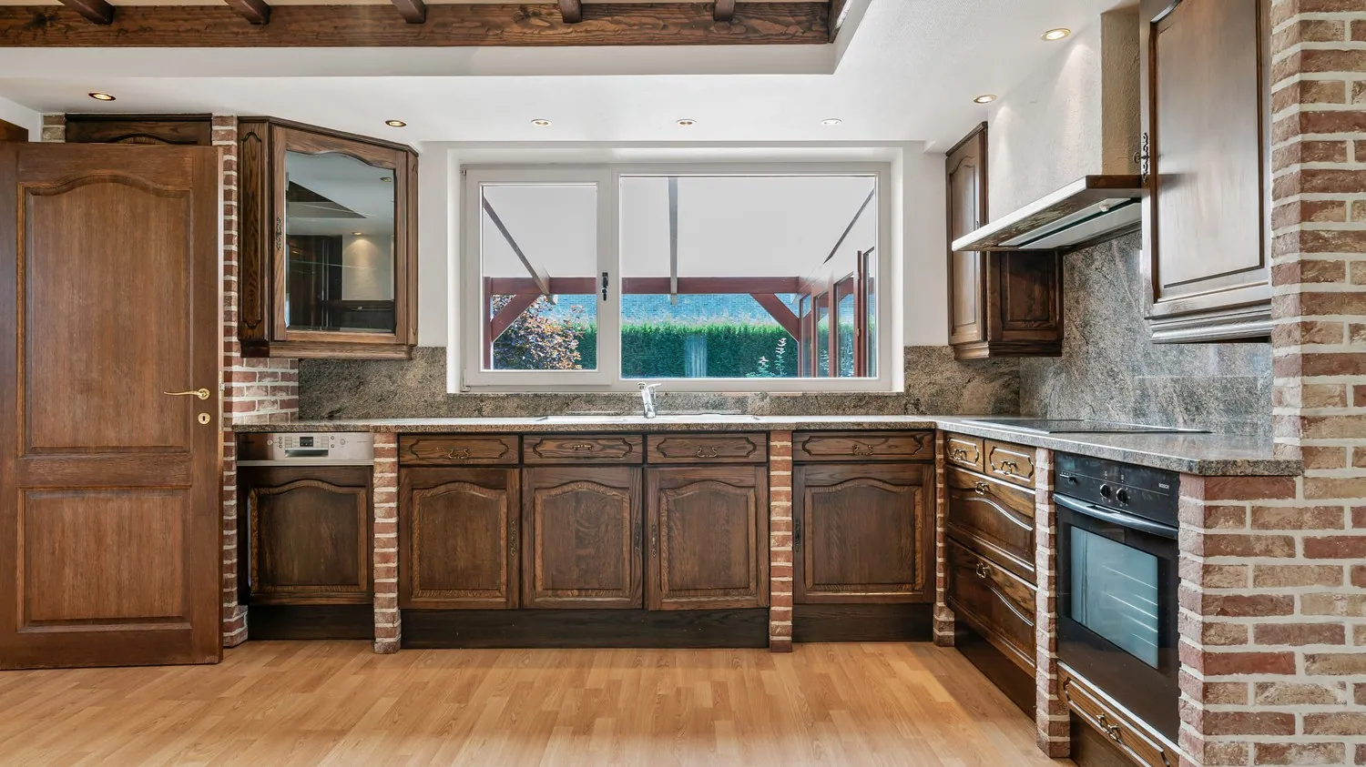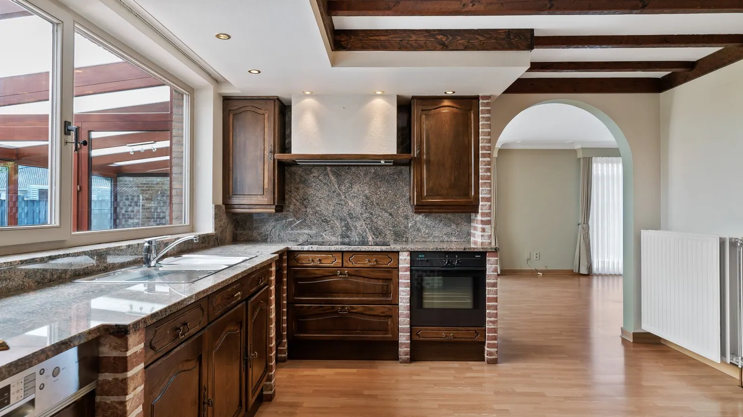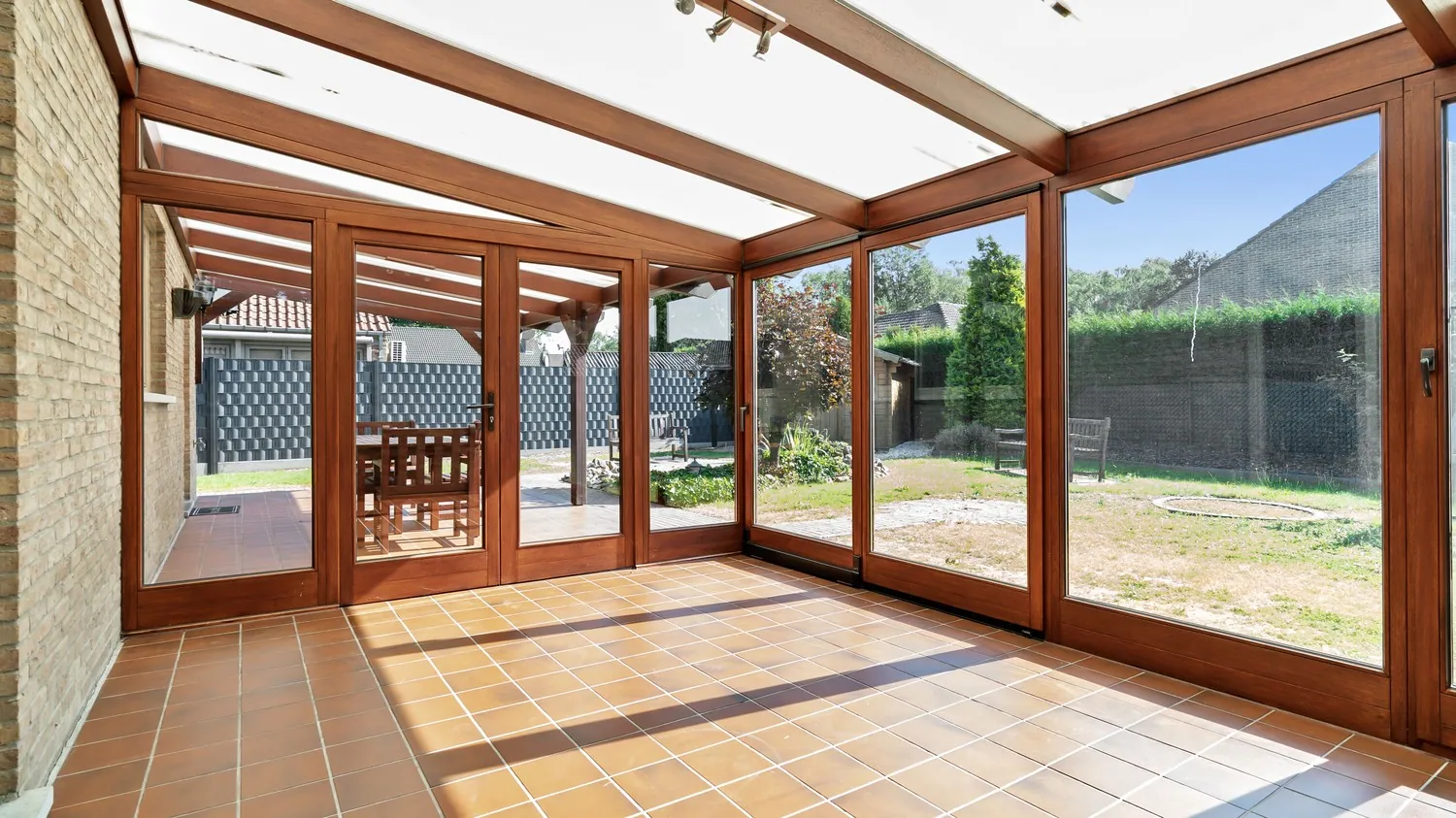 Al het woonplezier van dit huis bevindt zich gelijkvloers. Via de ingang aan de zijkant van de woning kom je uit in de inkomhal. Deze geeft uit op de leefruimte met naastgelegen keuken. De keuken is uitgerust met inbouwapparatuur (vaatwasser, oven, magnetron, keramische kookplaat, koelkast en spoelbak) en hoekkasten voor extra opbergruimte. Naast de keuken is er een praktische bijkeuken met aansluiting voor wasmachine en droogkast.