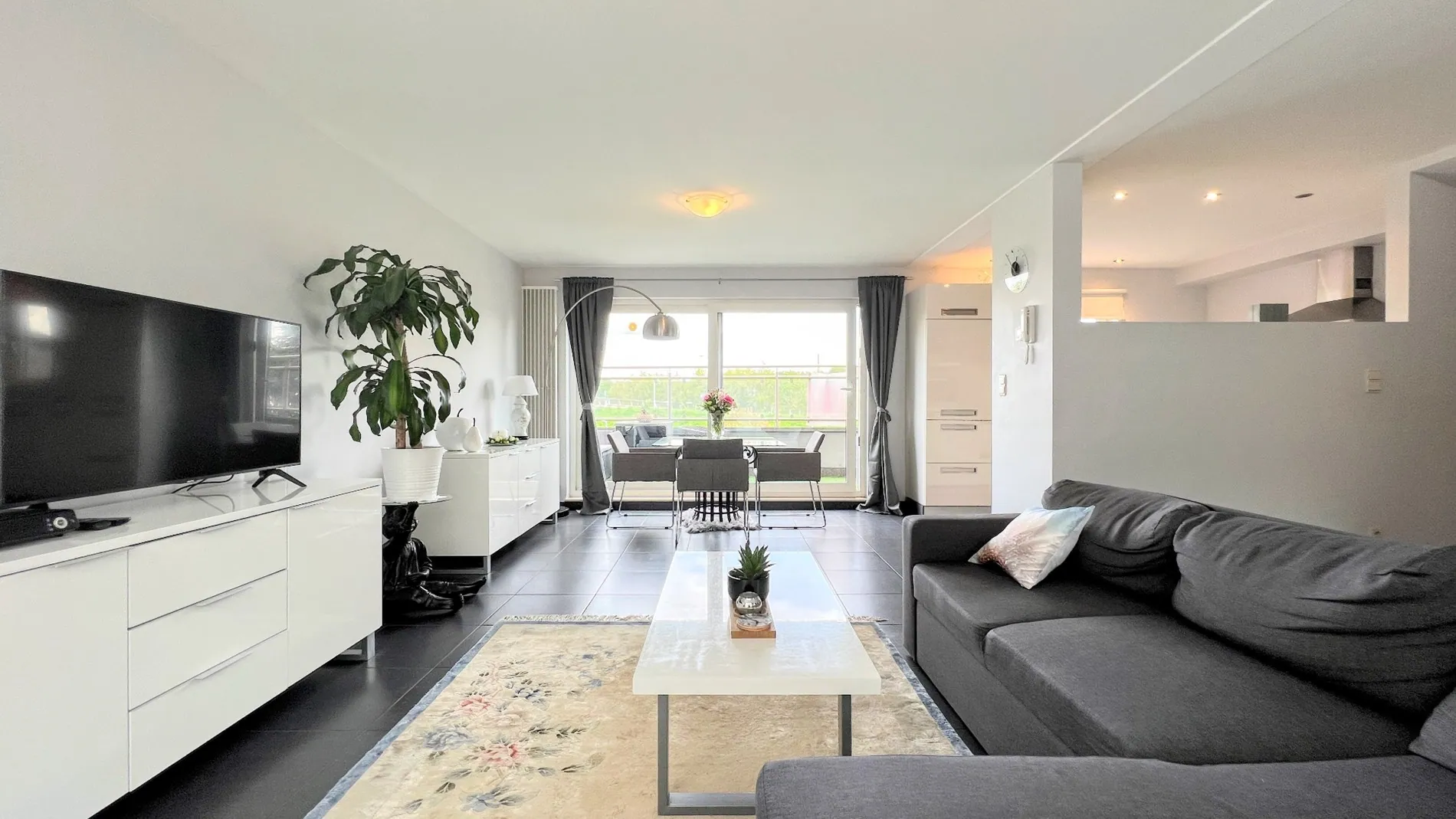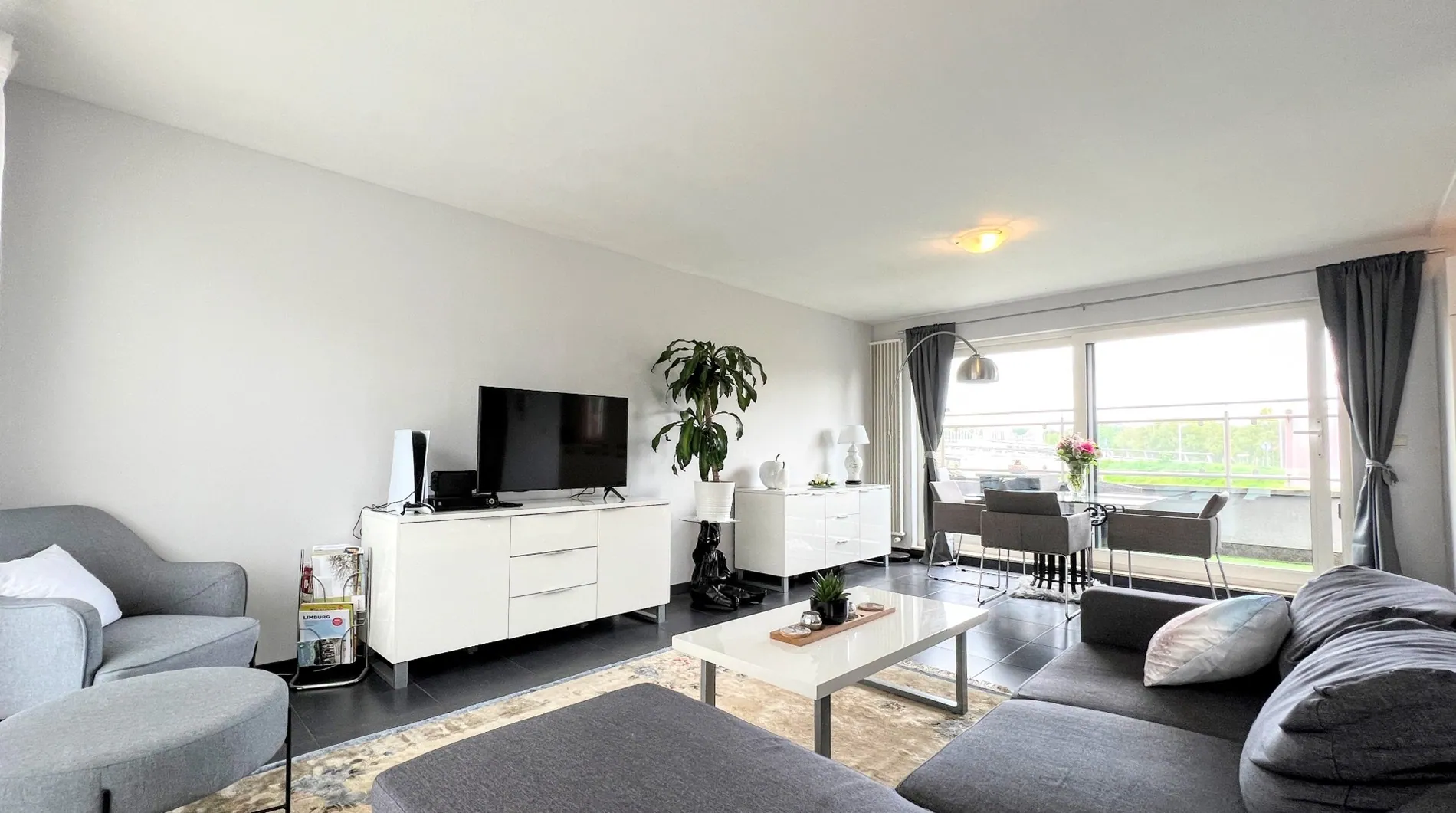Op de eerste etage is er een ruime leefruimte met open keuken. De moderne keuken is ... uitgerust met inbouwapparatuur. Vanuit de leefruimte heb je toegang tot het terras met panoramisch uitzicht op onder andere de Brug bij Kanne.