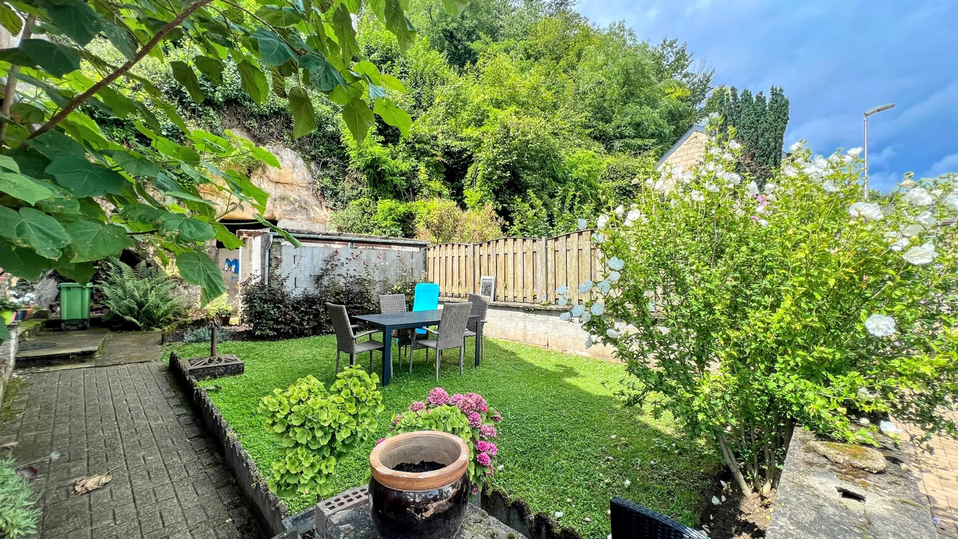 Aan de rechterzijde van de woning is er een gezellige, onderhoudsvriendelijke tuin met de ingang naar een tweede grot en een fietsenstalling.