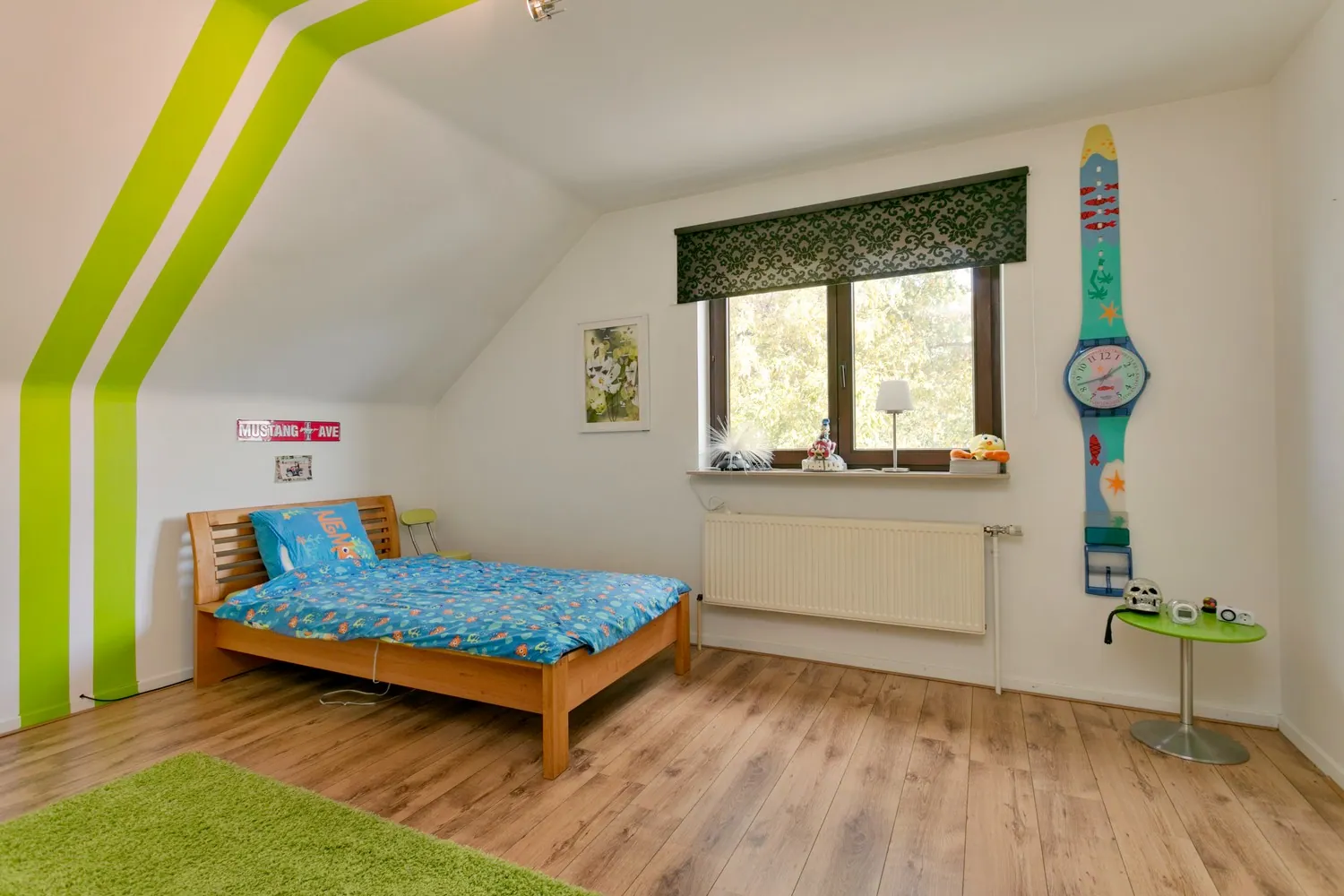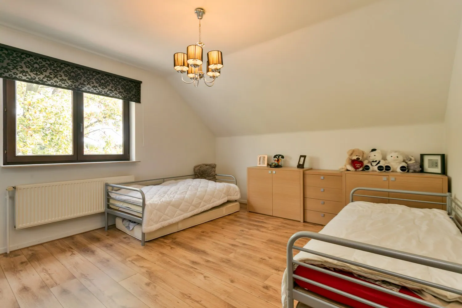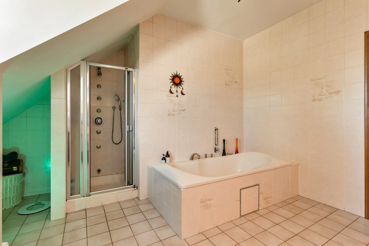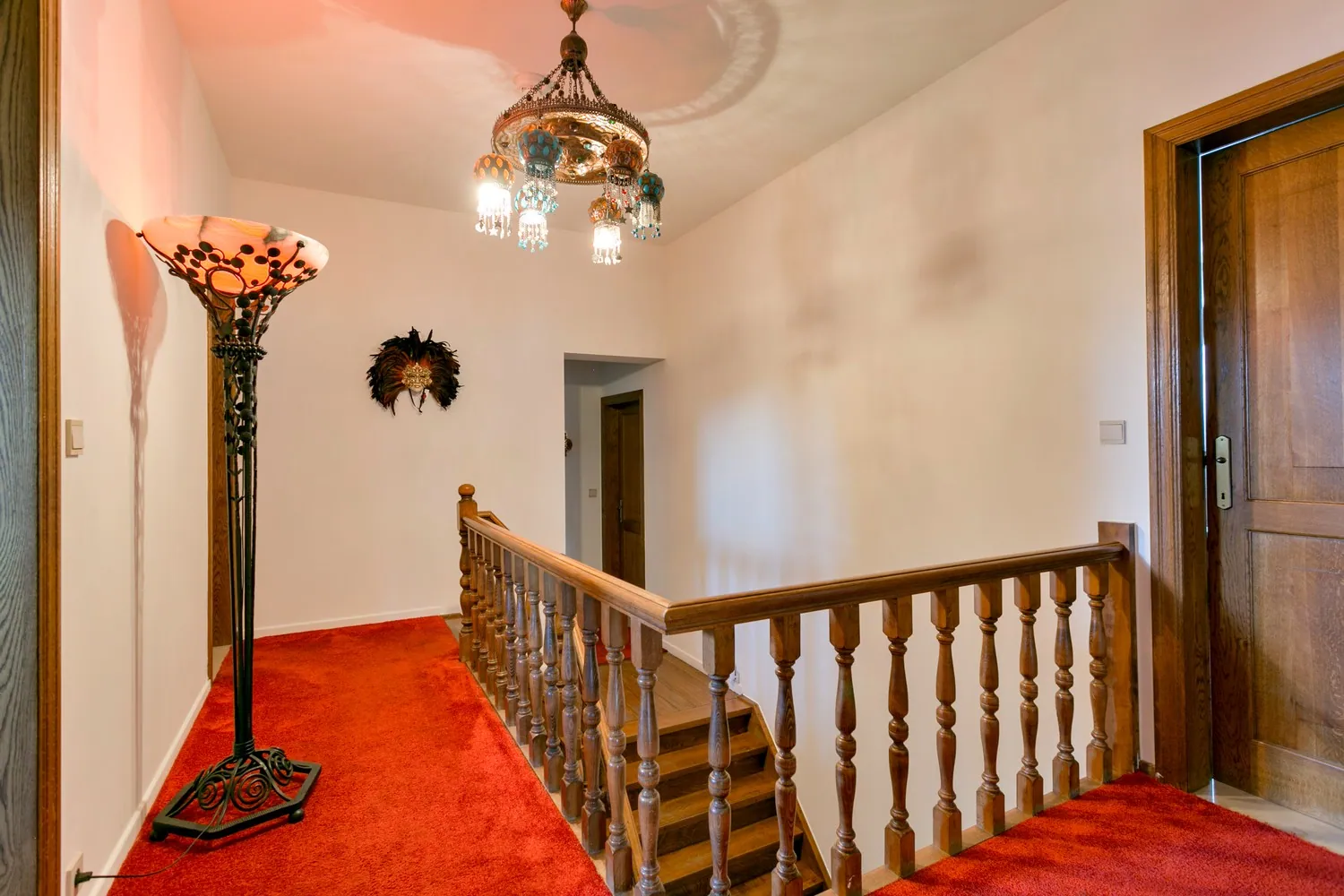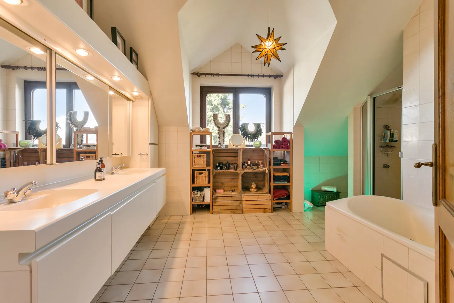 Op de eerste etage zijn er vier ruime slaapkamers en een badkamer met dubbel lavabomeubel, ligbad en douche.