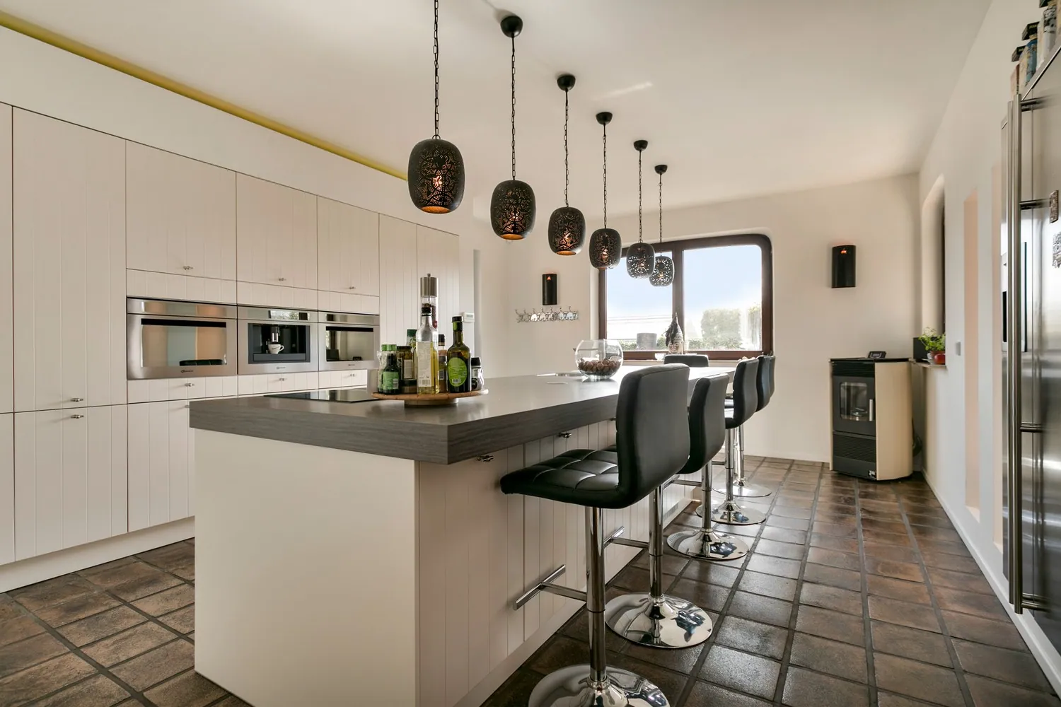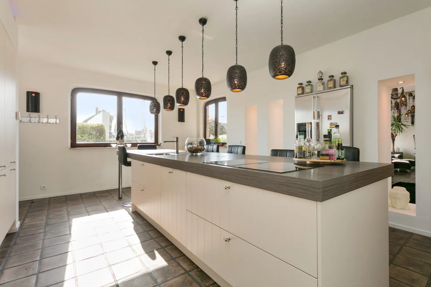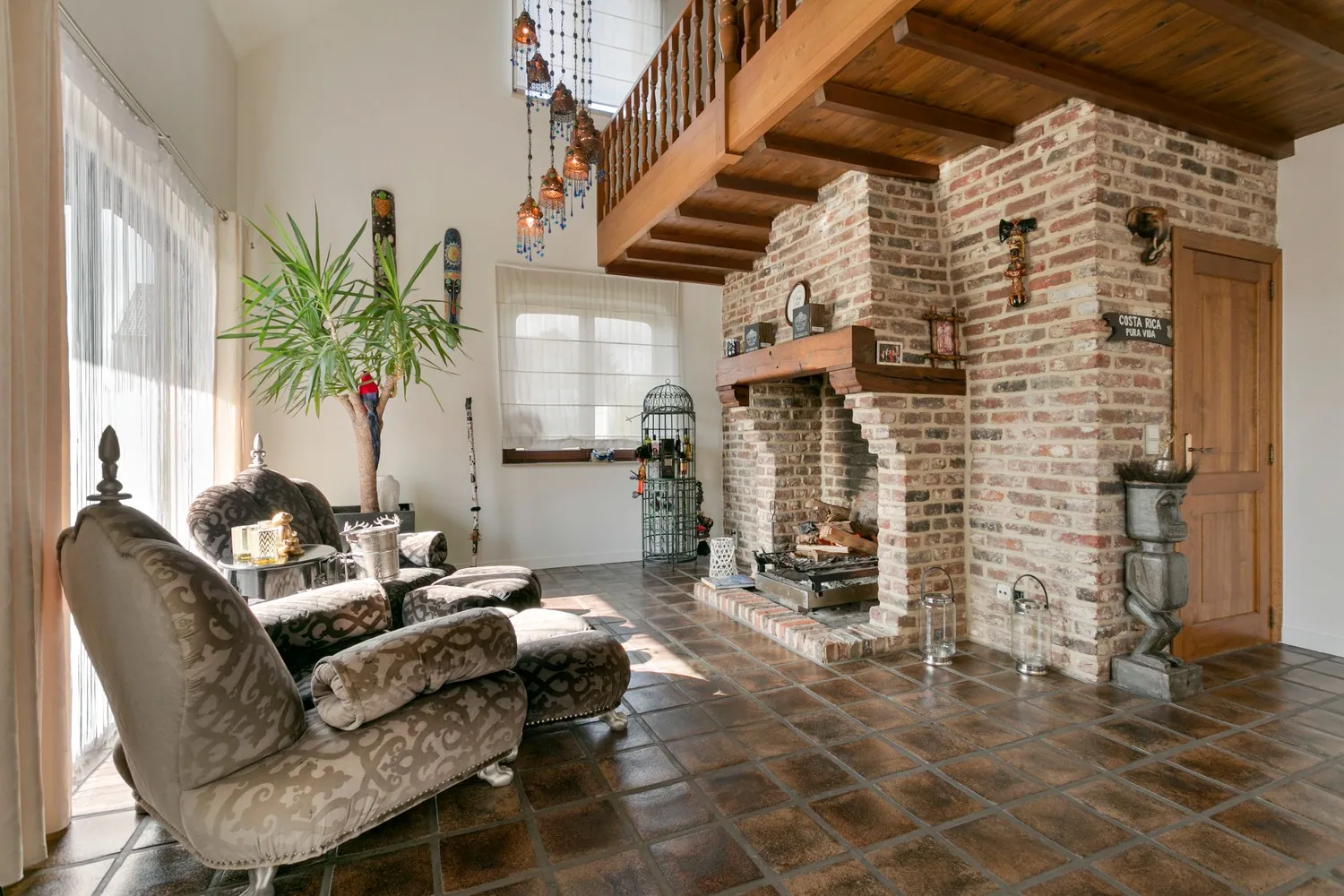 Via de inkomhal kom je uit in de charmante woonkamer met openhaard. Naastgelegen bevindt zich de moderne, luxe keuken met pelletkachel en inbouwapparatuur: koffiemachine, inductiekookplaat, afwasmachine, combi-oven, magnetron én Amerikaanse koelkast.