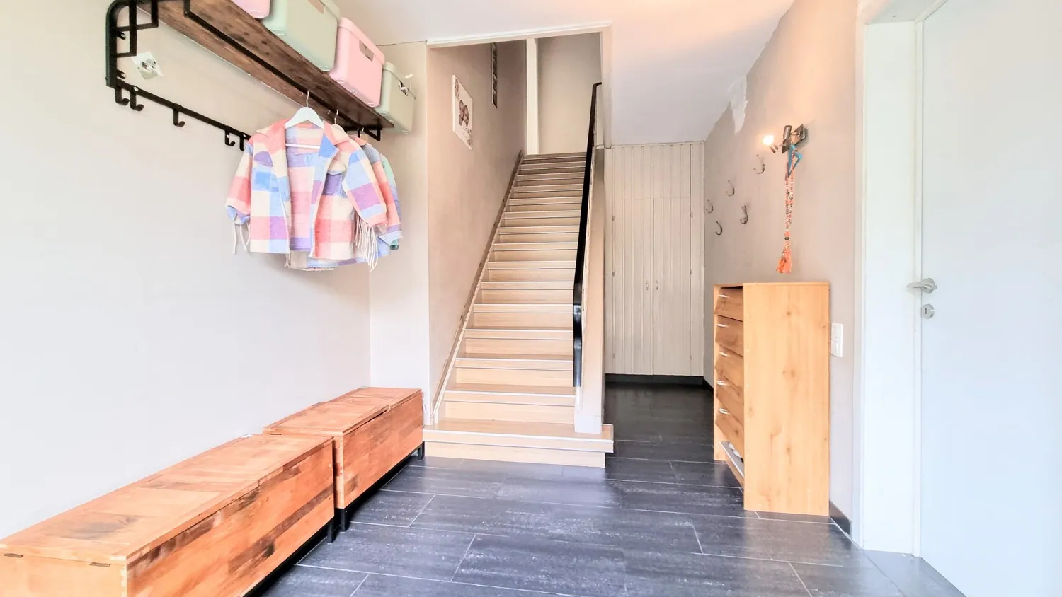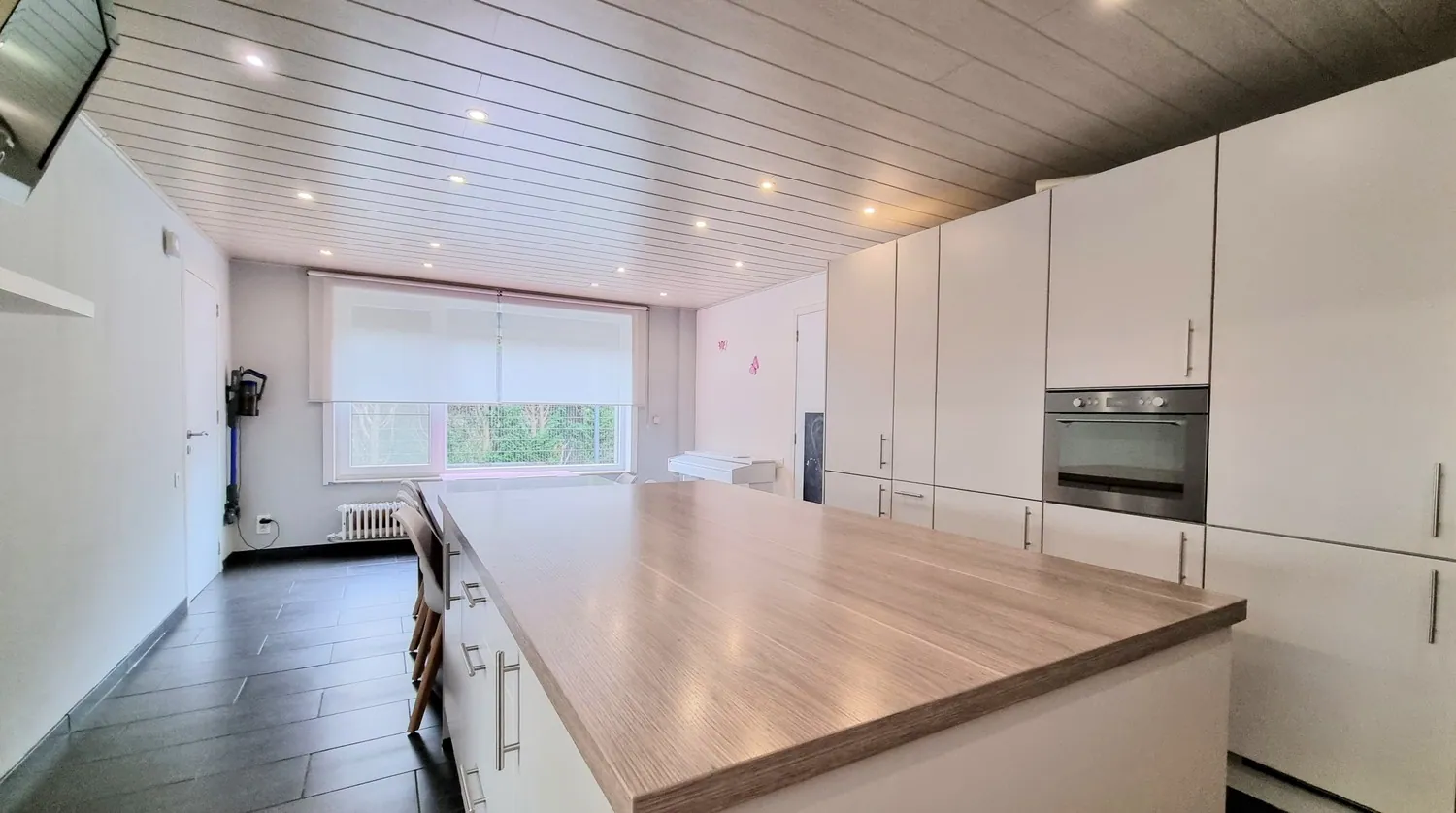Via de inkomhal met gastentoilet bereik je de moderne leefkeuken en lichtrijke woonkamer. De woonkamer is opgedeeld in een gezellige zit- en eethoek. De keuken is uitgerust met degelijke inbouwapparatuur (inductiekookplaat, afwasmachine, koelkast, combi-oven).