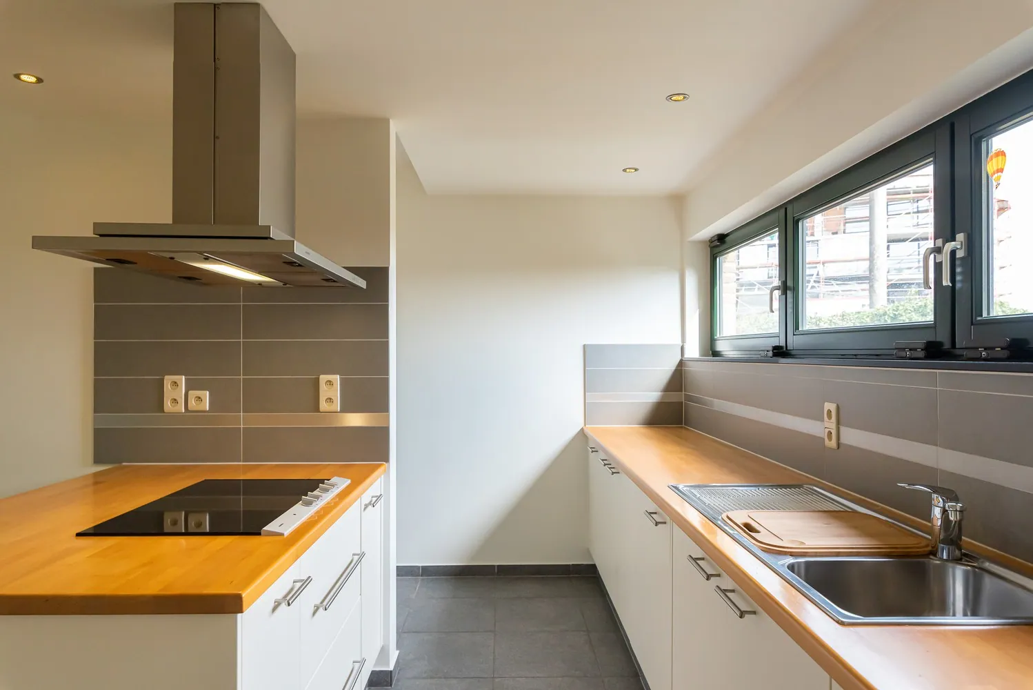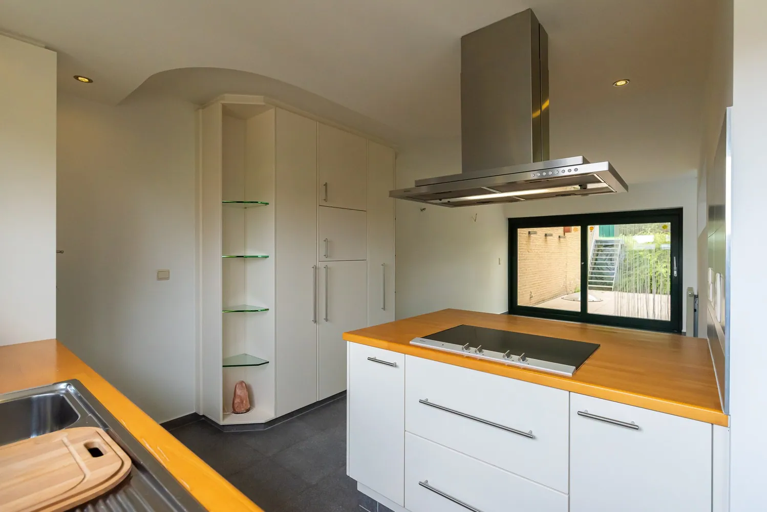 Aansluitend op de leefruimte is er een ingerichte keuken voorzien van degelijke inbouwapparatuur ... (keramische kookplaat, dampkamp, heteluchtoven, dubbele spoelbak en koelkast). Verder is er op deze verdieping nog een afzonderlijk toilet en een ruime berging.