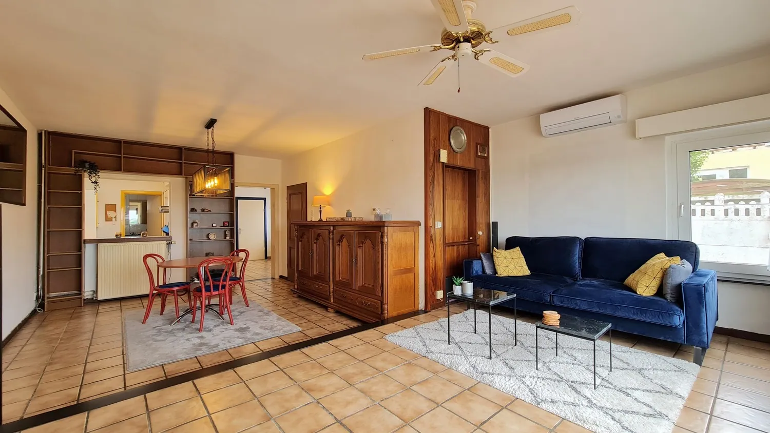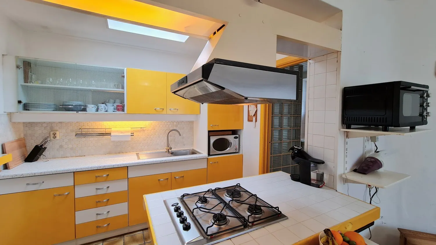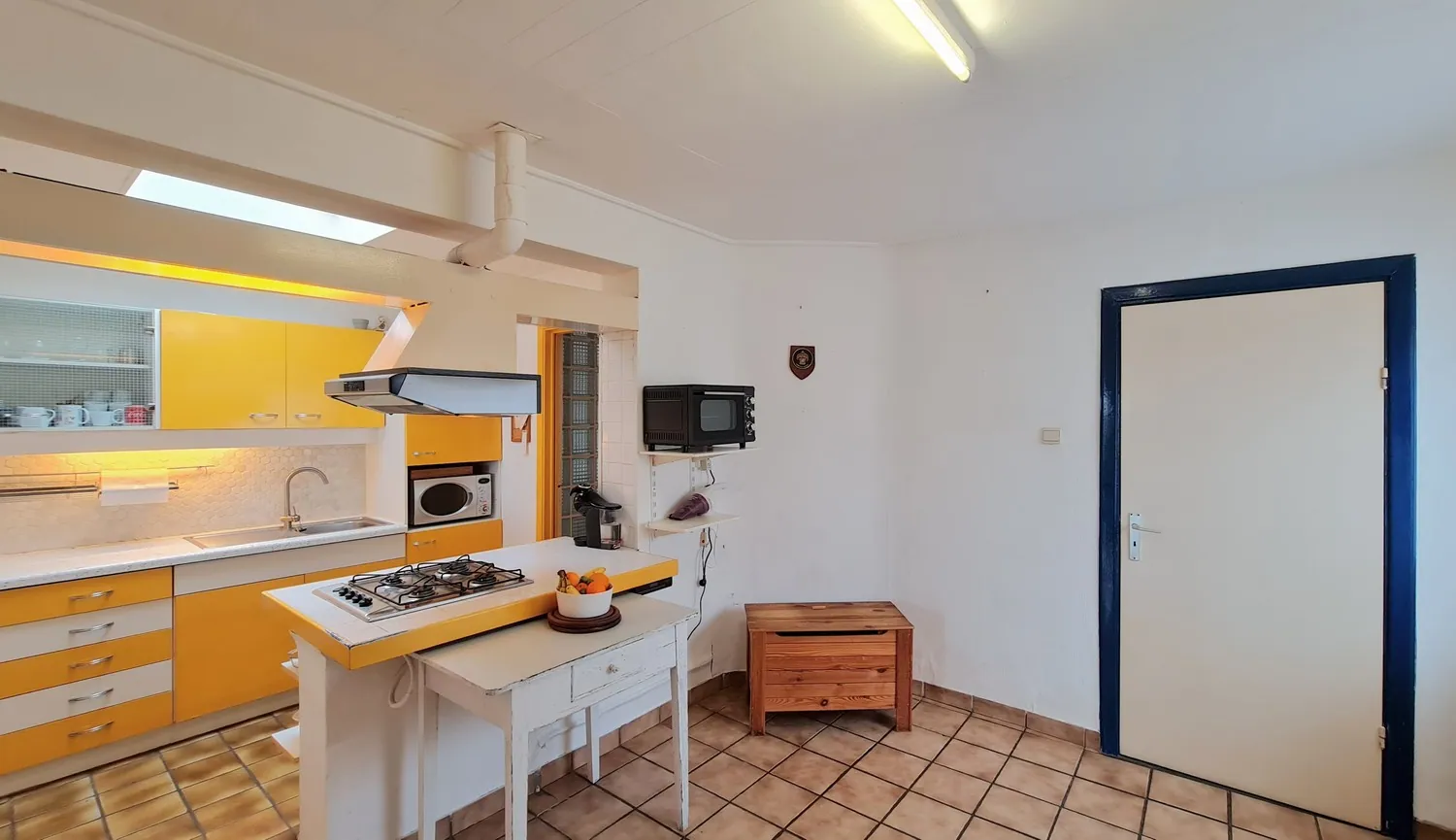 Via de inkomhal kom je uit in de leefruimte met airconditioning. Deze bestaat uit twee niveaus en kan ingedeeld worden als zit- en eethoek. De grote ramen zorgen ervoor dat je altijd kan genieten van het buitengewone uitzicht op de Maas. Naast de leefruimte is er een praktische keuken die is uitgerust met gasfornuis en spoelbak.