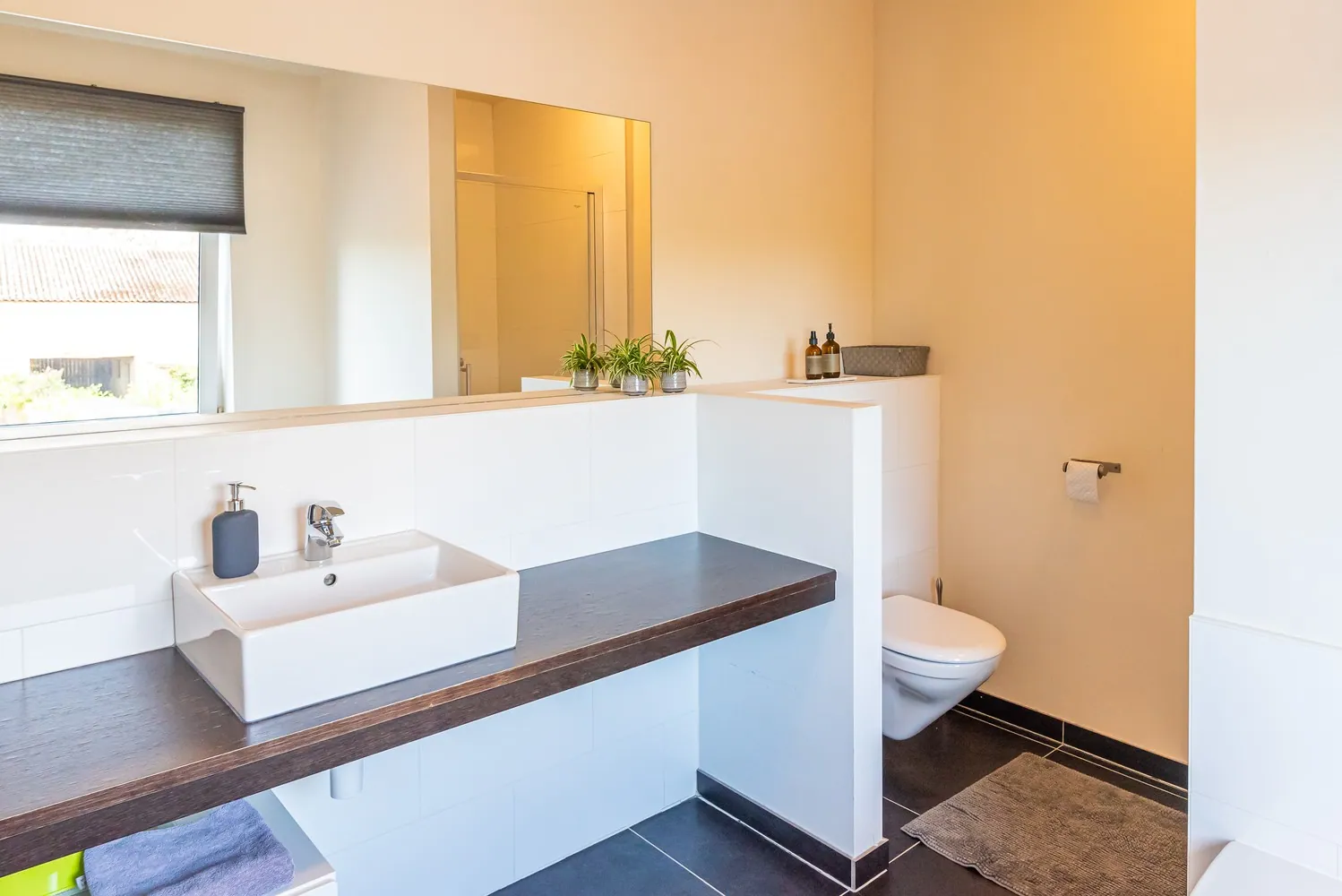 Op de eerste verdieping leidt de nachthal naar een slaapkamer van 18 m² en een moderne badkamer. Deze is ingericht met een inloopdouche, een toilet, een ligbad en een lavabomeubel.