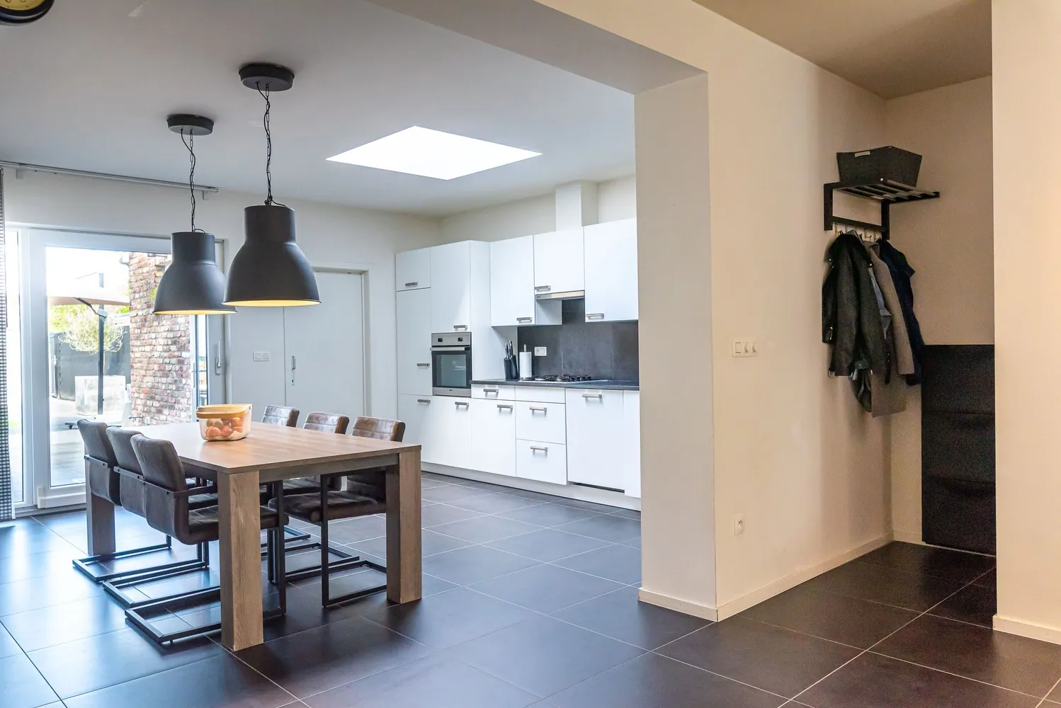 De inkomhal met gastentoilet en vestiaire leidt naar de lichtrijke leefruimtes.