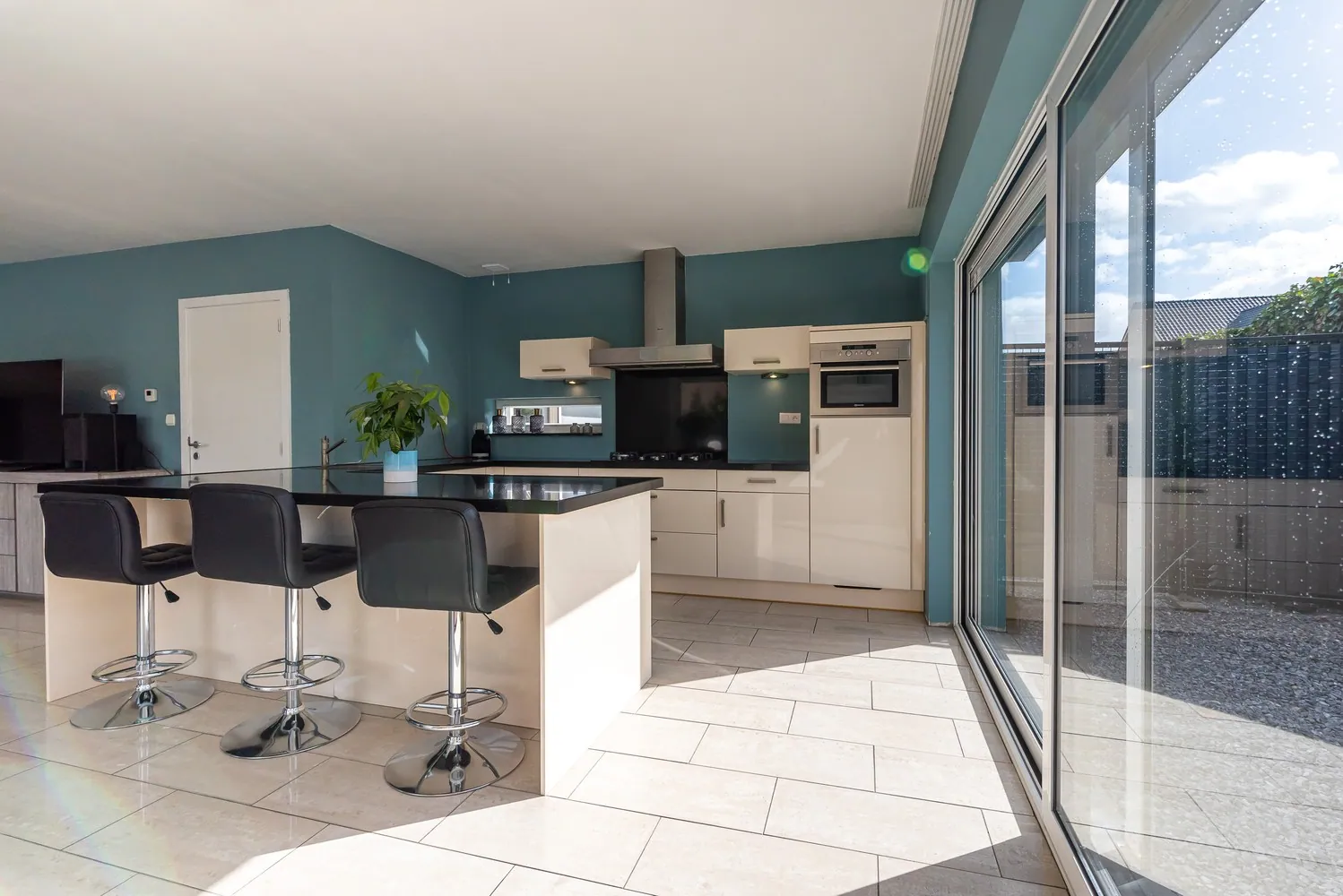 De ingerichte keuken met composiet werkblad is voorzien van degelijke inbouwapparatuur (gasfornuis, combi-oven, vaatwasser en koelkast). Verder bevindt zich op de benedenverdieping een inpandige garage met sectionaalpoort en een praktische bergruimte met aansluiting voor wasmachine en droogkast.