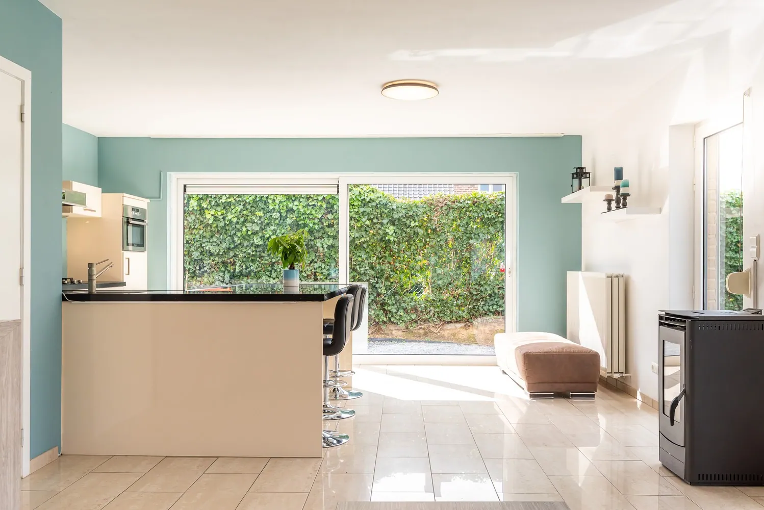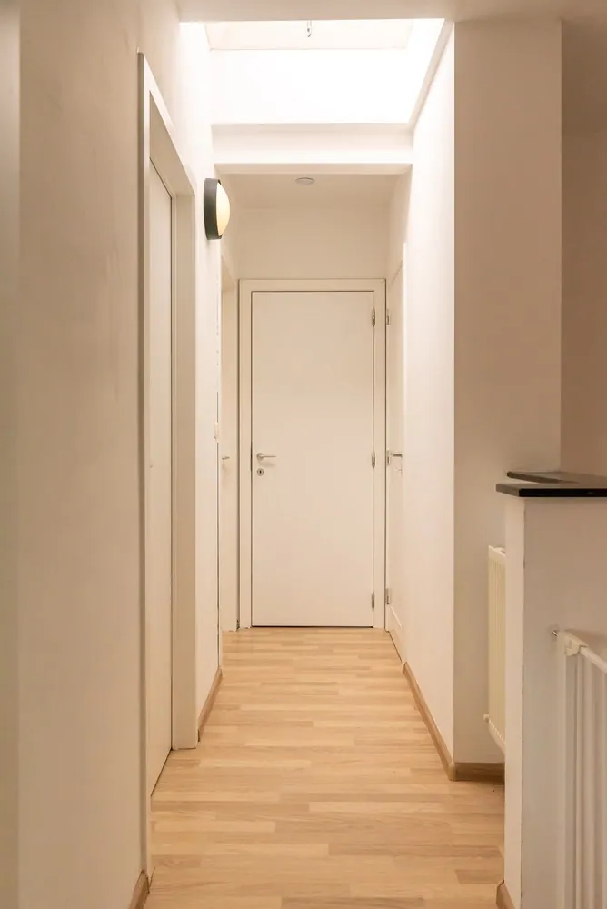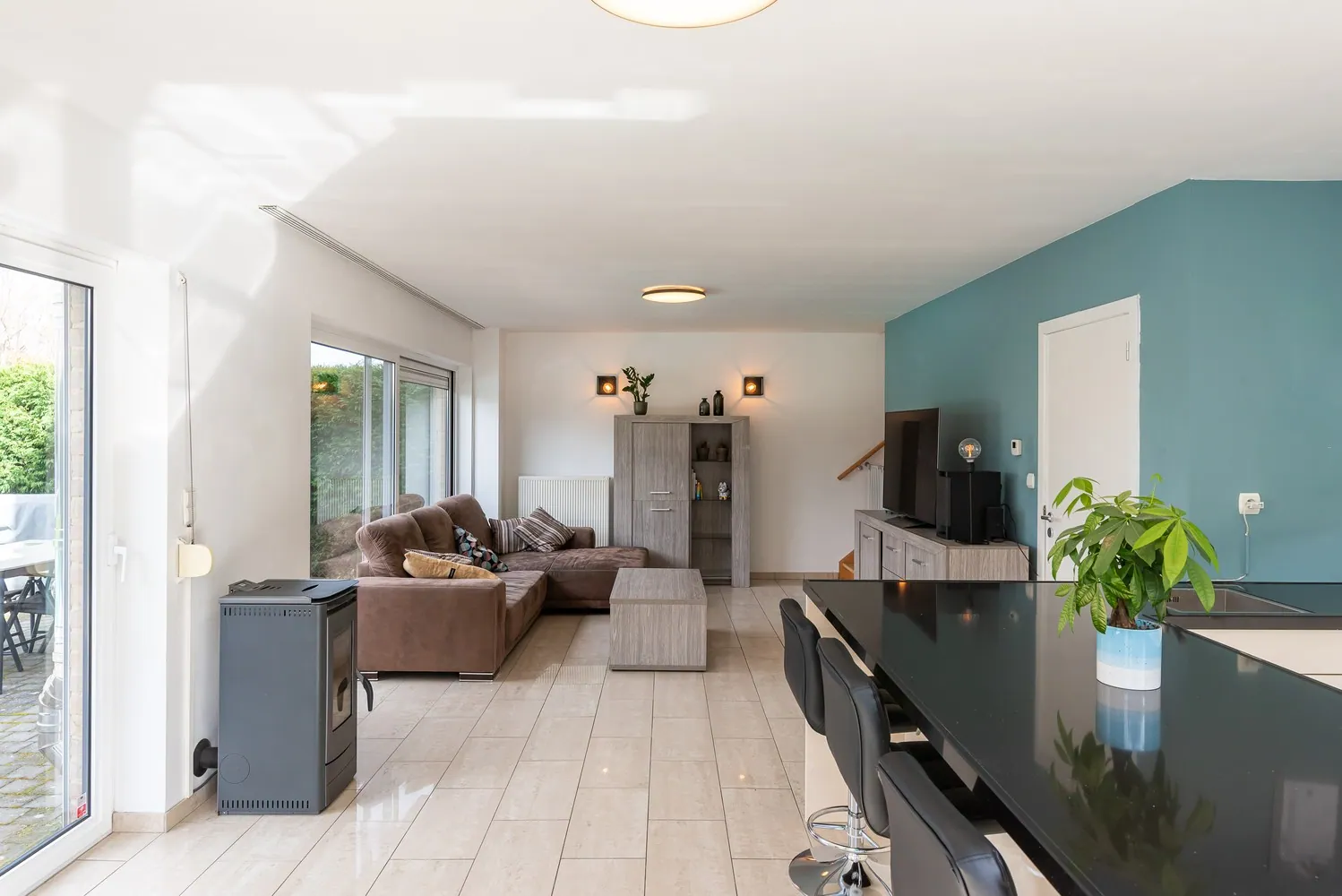 De inkomhal met gastentoilet geeft uit op een lichtrijke leefruimte van 42 m², ingedeeld in een open keuken en een ruime woonkamer. Hier geniet je van een aangename lichtinval en heb je een open zicht op de achtertuin. Centraal bevindt zich een sfeervolle pelletkachel die zorgt voor warmte en gezelligheid.