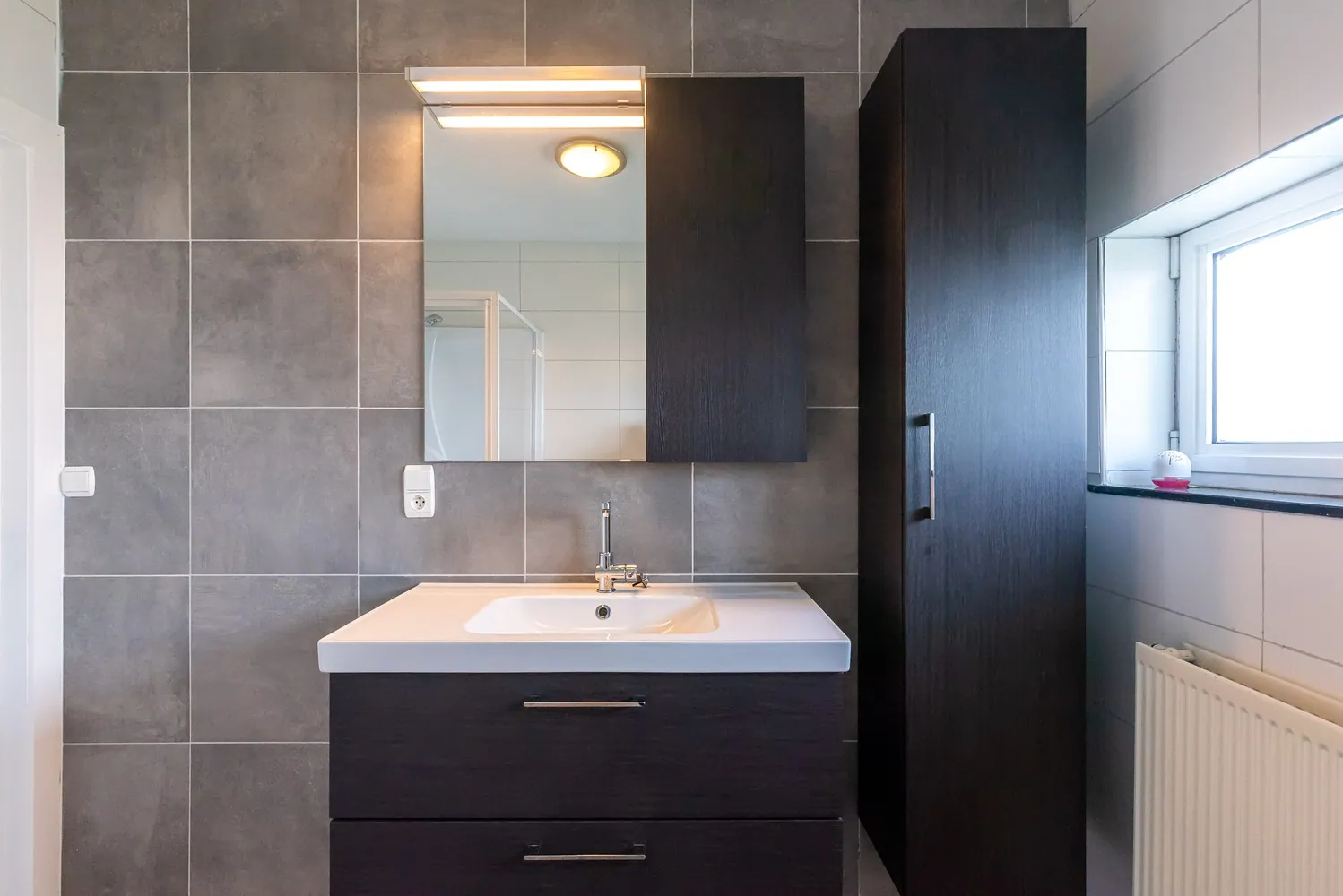 In de badkamer is er een lavabomeubel, een douchecabine en een nachttoilet.