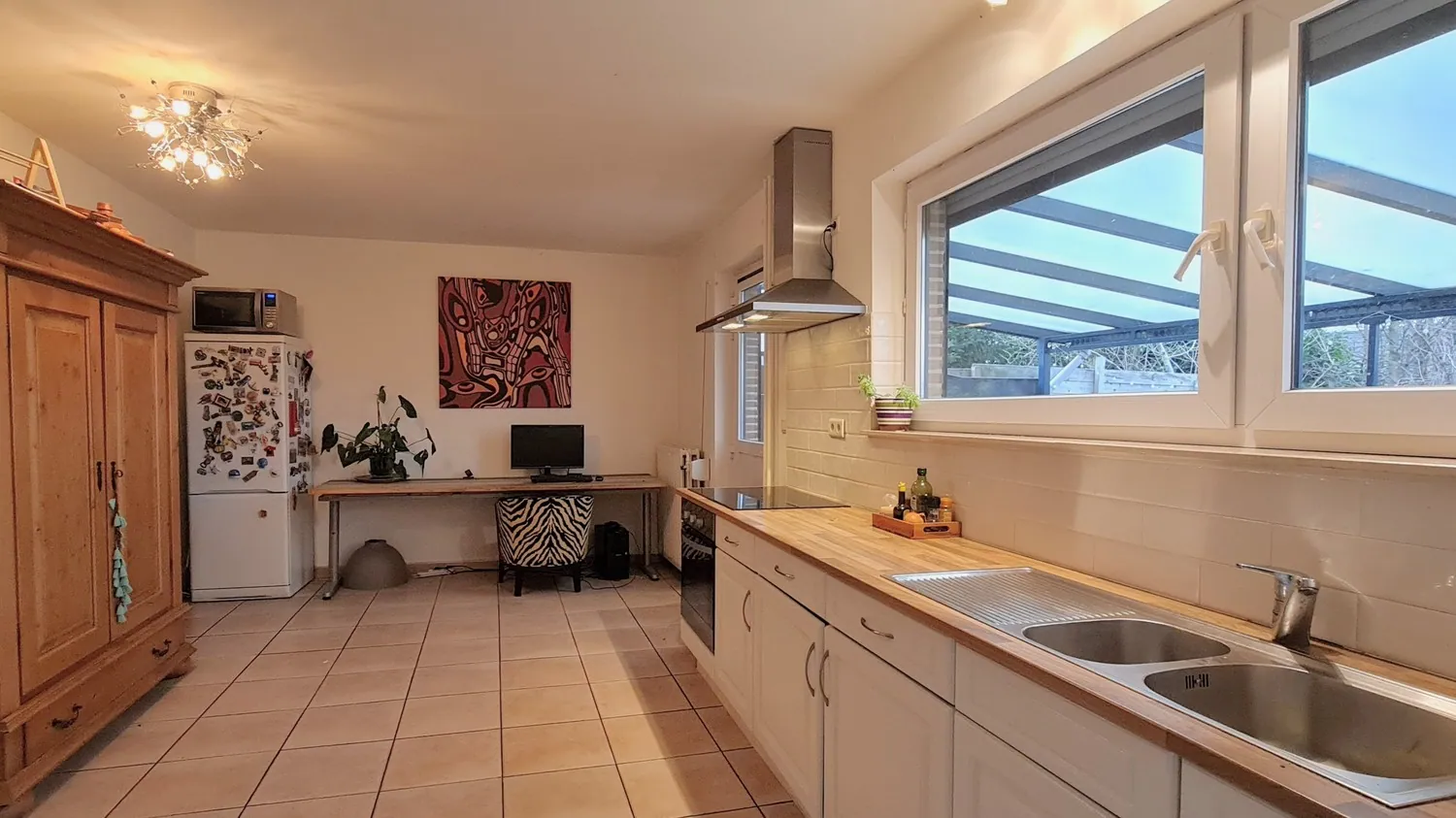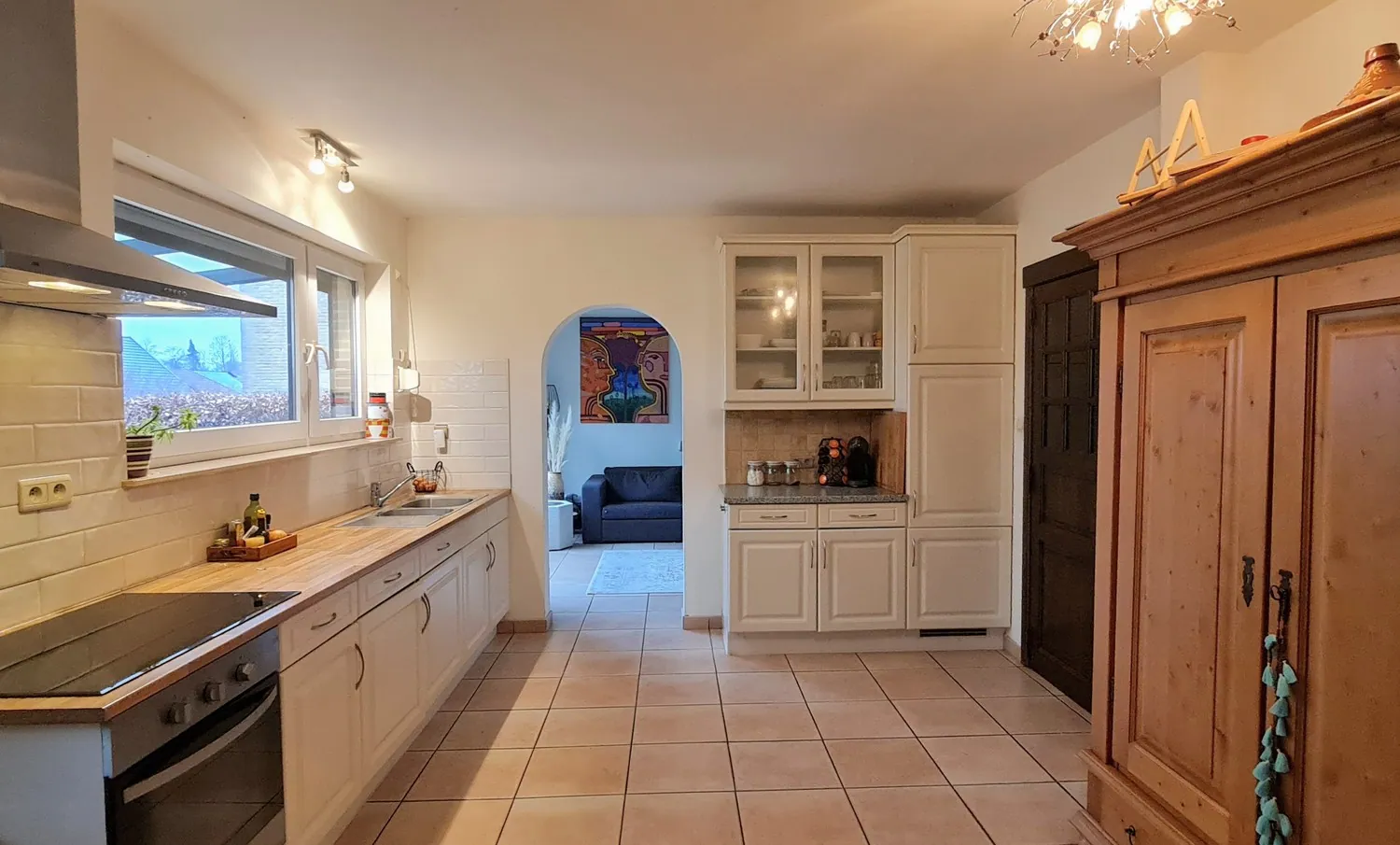 De naastgelegen ... leefkeuken is in 2005 charmant gerenoveerd. Deze werd ingericht met degelijke ingebouwde keukenapparatuur (dampkap, keramisch vuur, dubbele spoelbak en combi-oven) en extra kastruimte. Van hieruit heb je toegang tot een ruim overdekt terras.