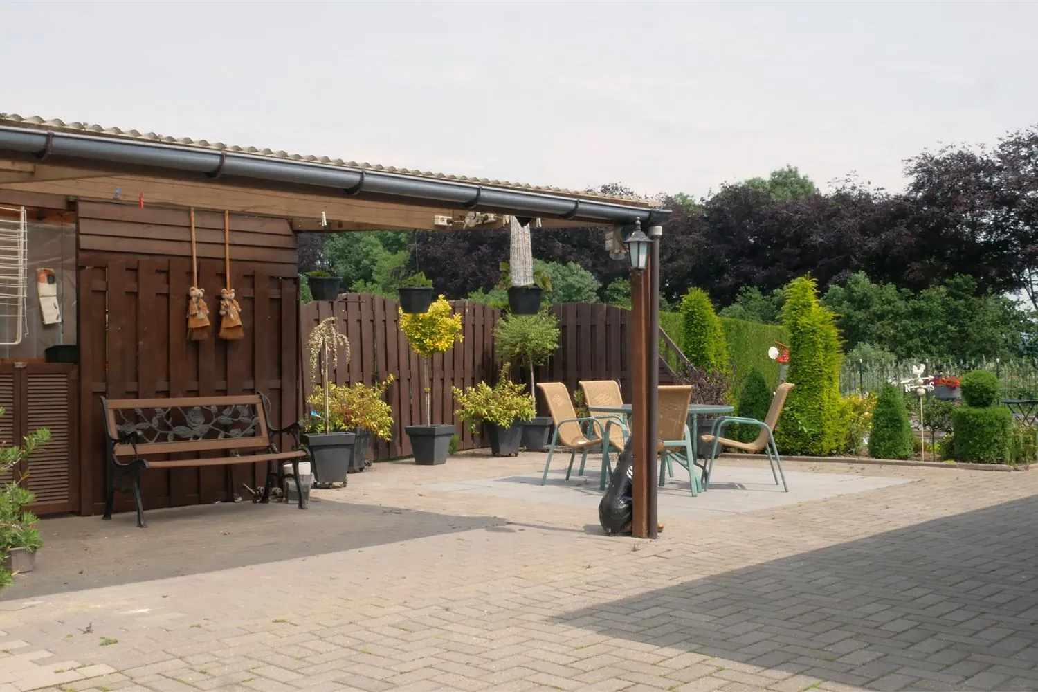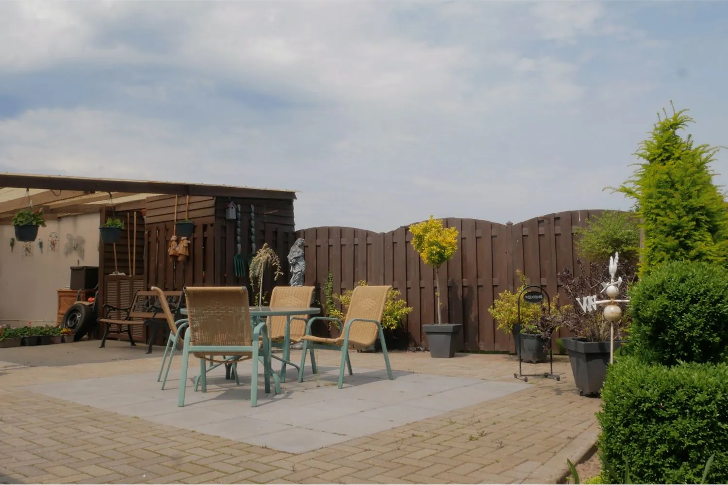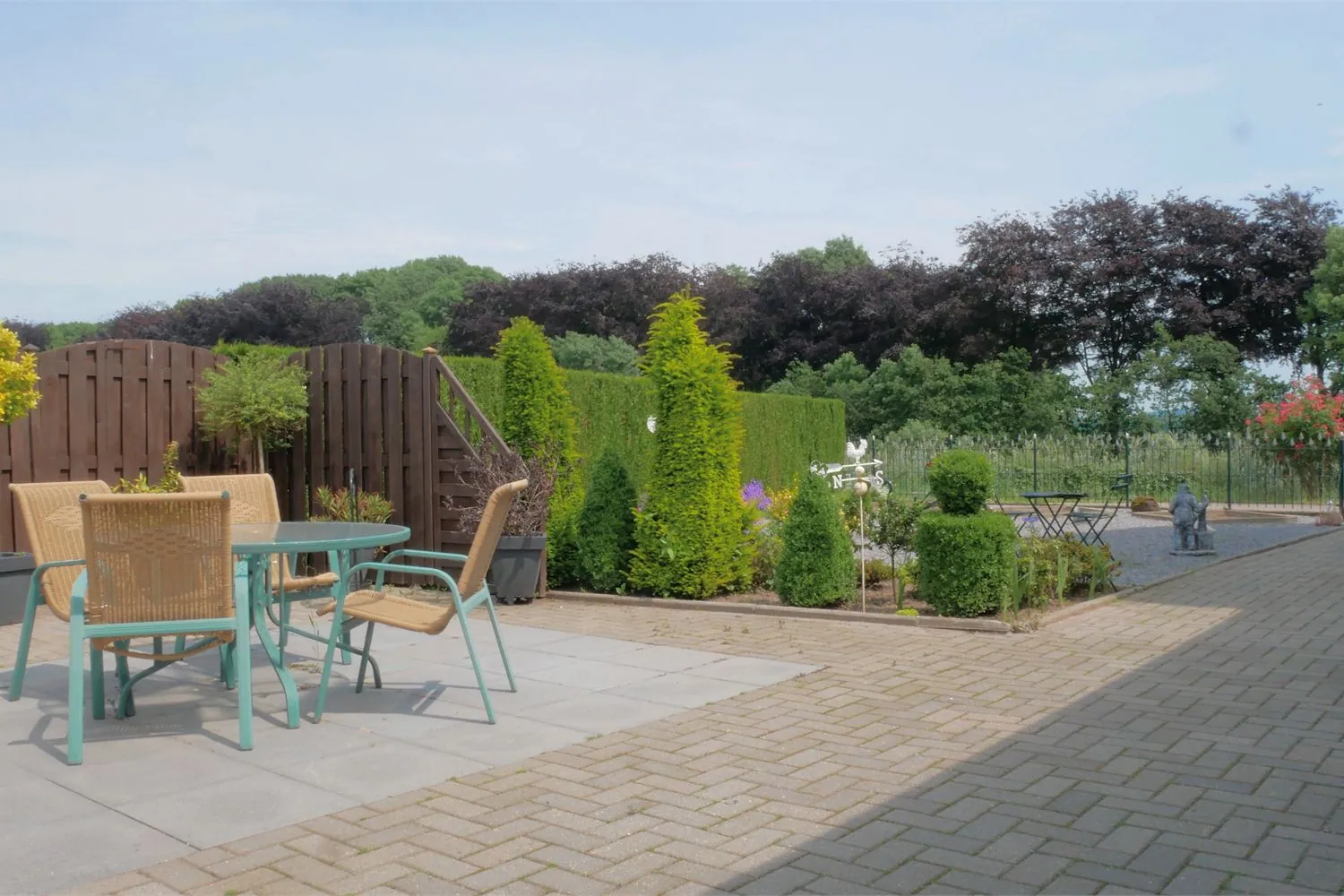De beklinkerde zij-oprit leidt naar een afzonderlijk garagegebouw met aanpalend een deels overdekt terras.