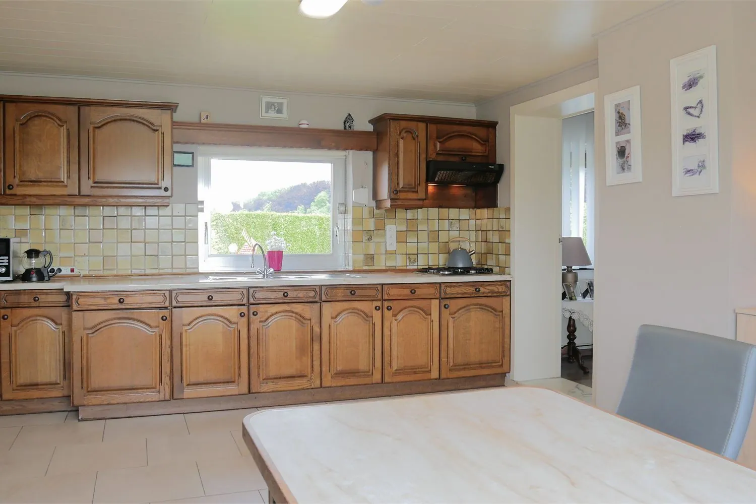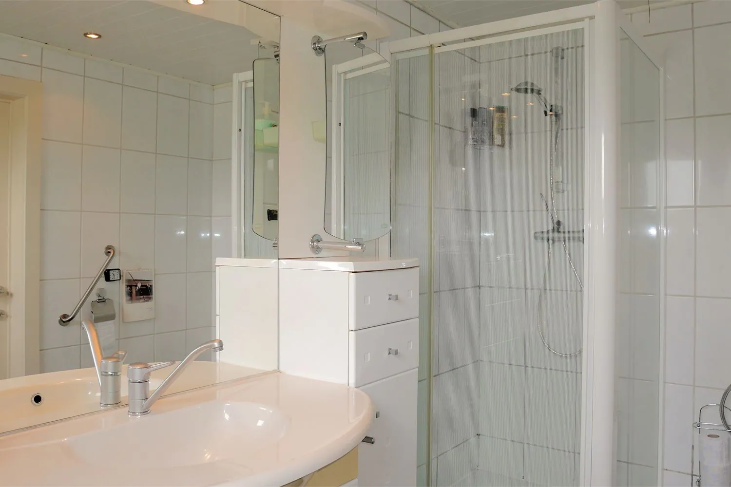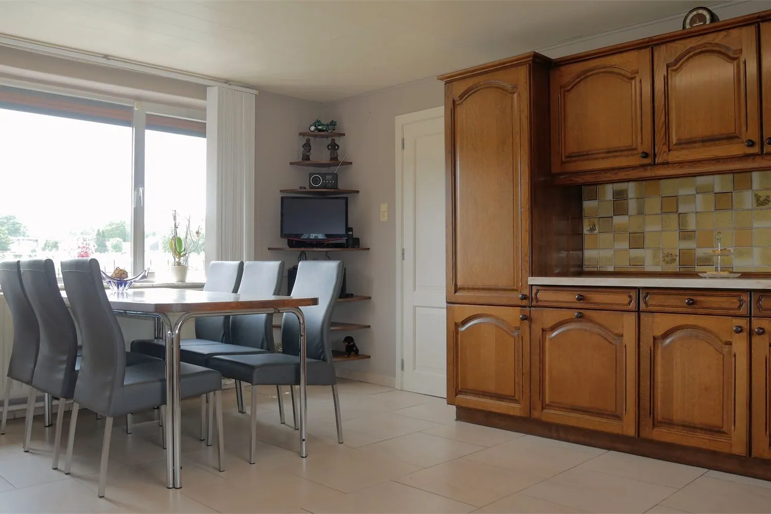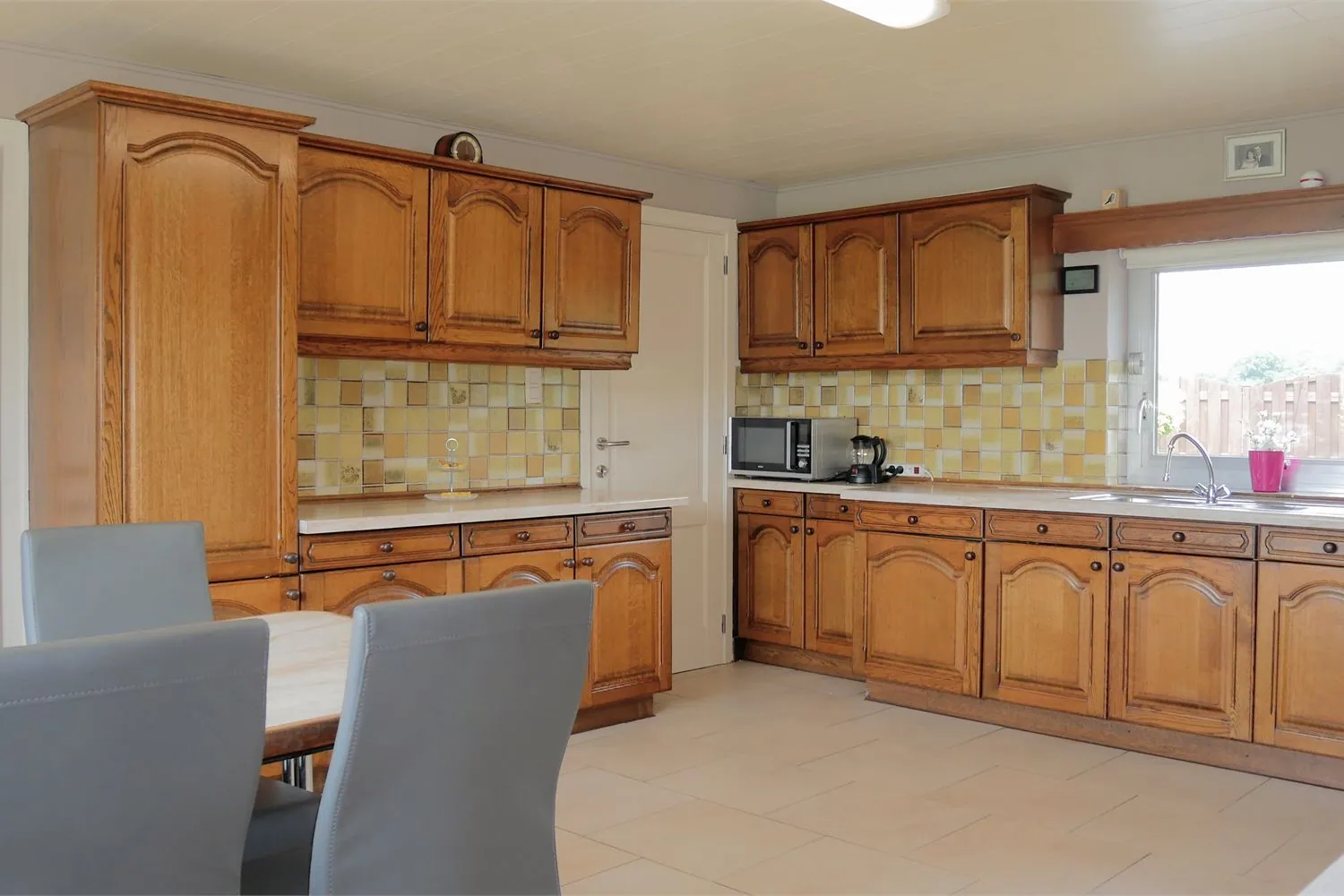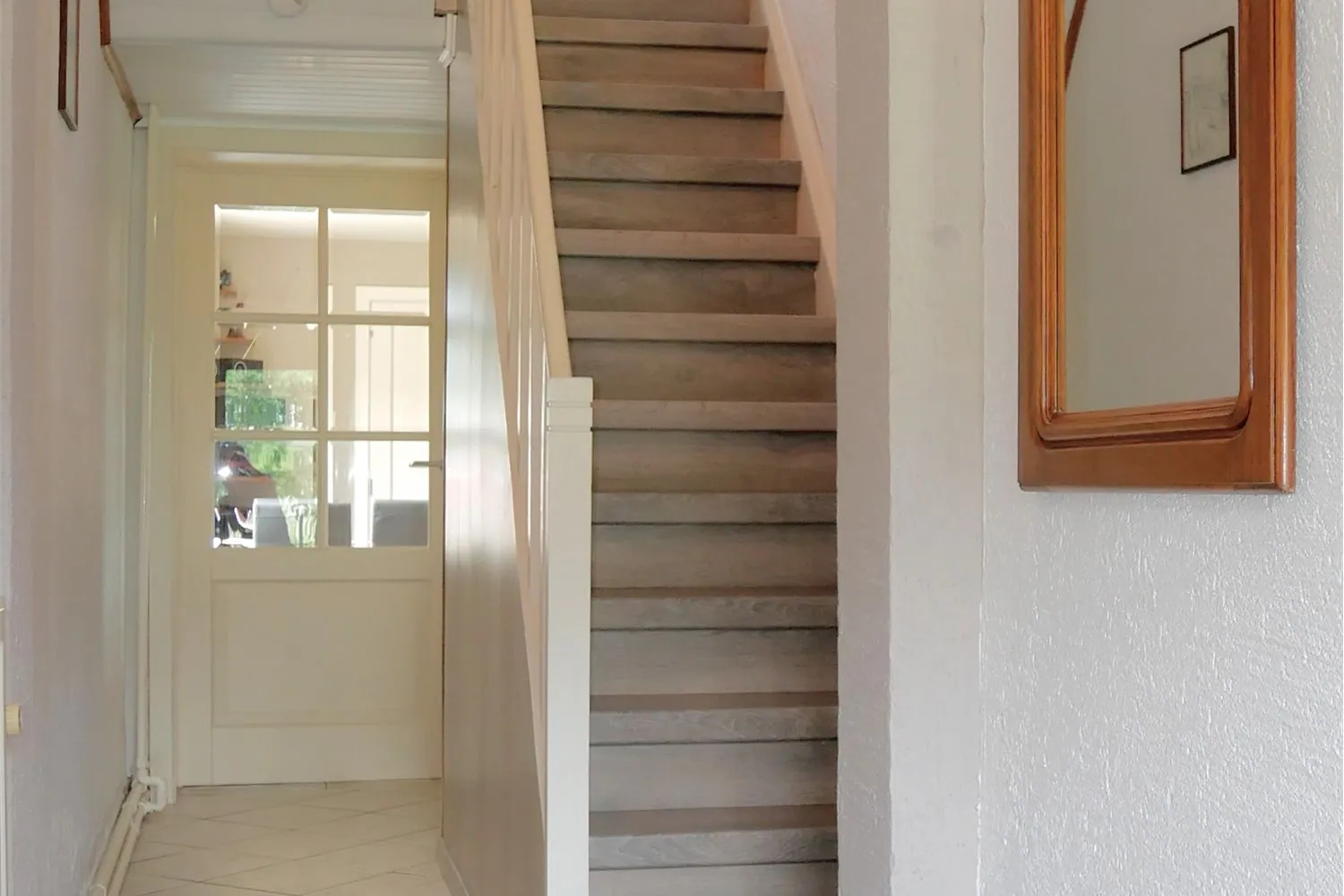 De inkomhal leidt naar de woonkamer en de keuken met eetkamer. In de badkamer is er een douche, een toilet en een lavabomeubel. Verder is er op de benedenverdieping nog een ruime bijkeuken en een praktische berging.