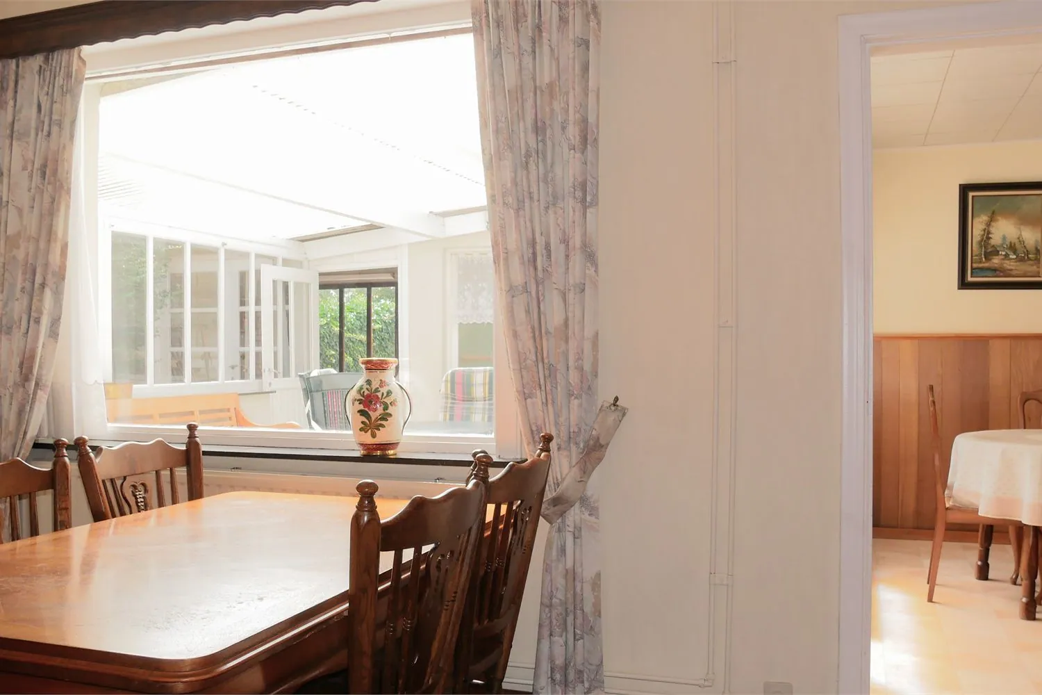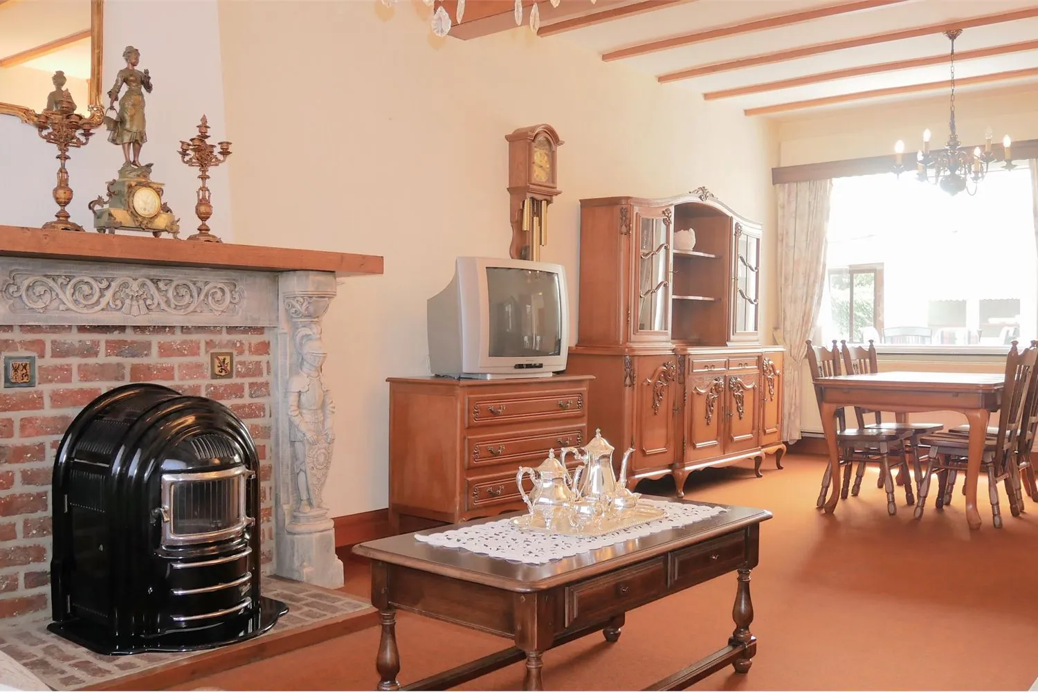 Op de benedenverdieping leidt de inkomhal naar de leefruimtes. De ruime woonkamer met originele stijlschouw en sierkachel heeft een oppervlakte van 33 m². Naastgelegen is er een eetkamer met aansluitend een eenvoudig ingerichte keuken. Via de ruime garage van 37 m² kom je uit op de veranda.