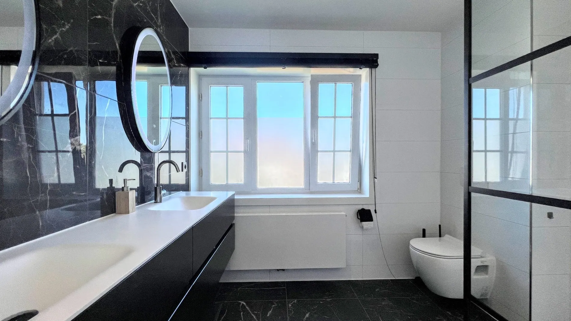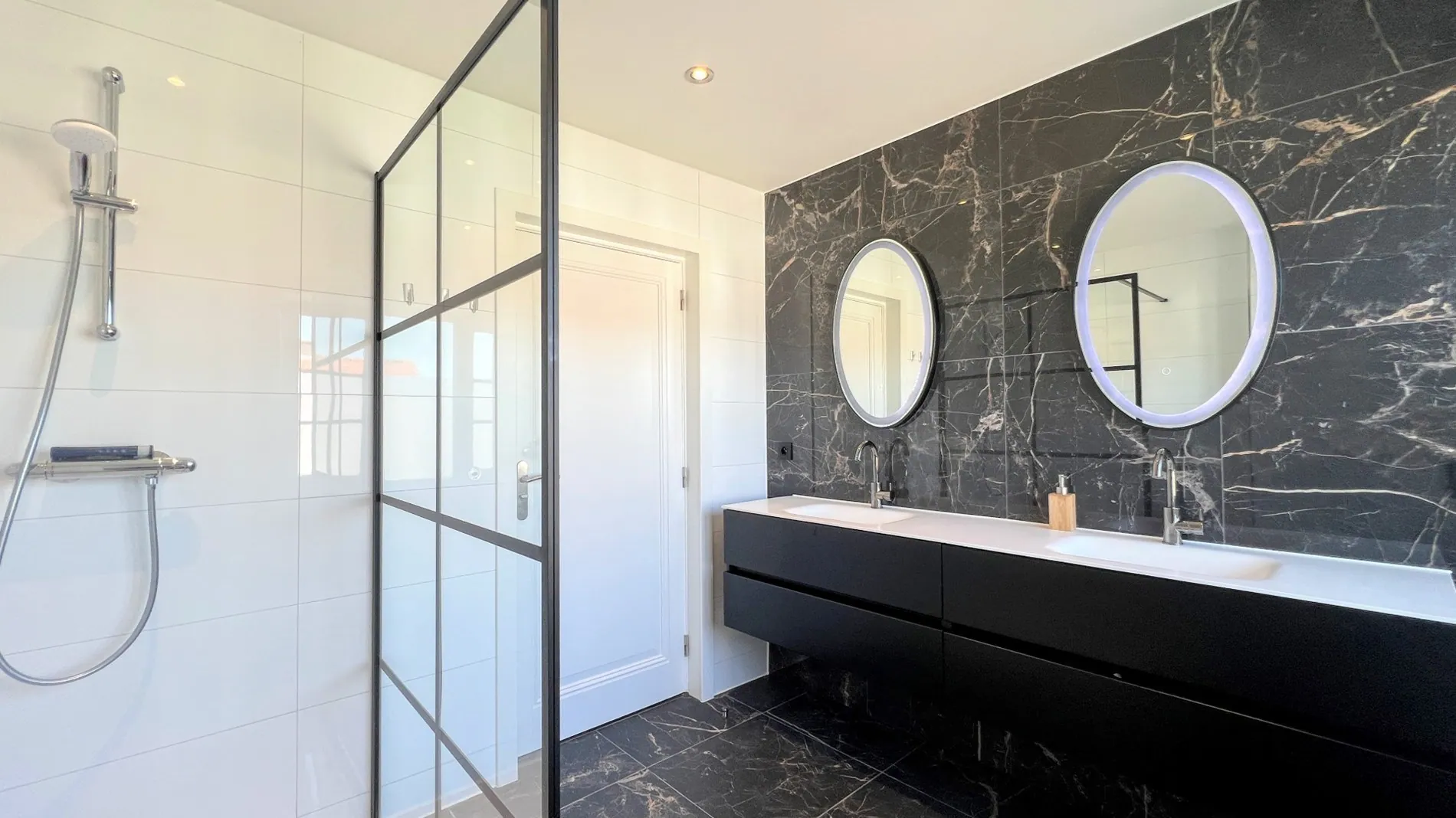 Op de eerste verdieping geeft de nachthal uit op drie ruime slaapkamers van 24 m², 14 m² en 11 m² en een moderne badkamer. De badkamer is ... uitgerust met een inloopdouche, toilet en dubbel lavabomeubel.