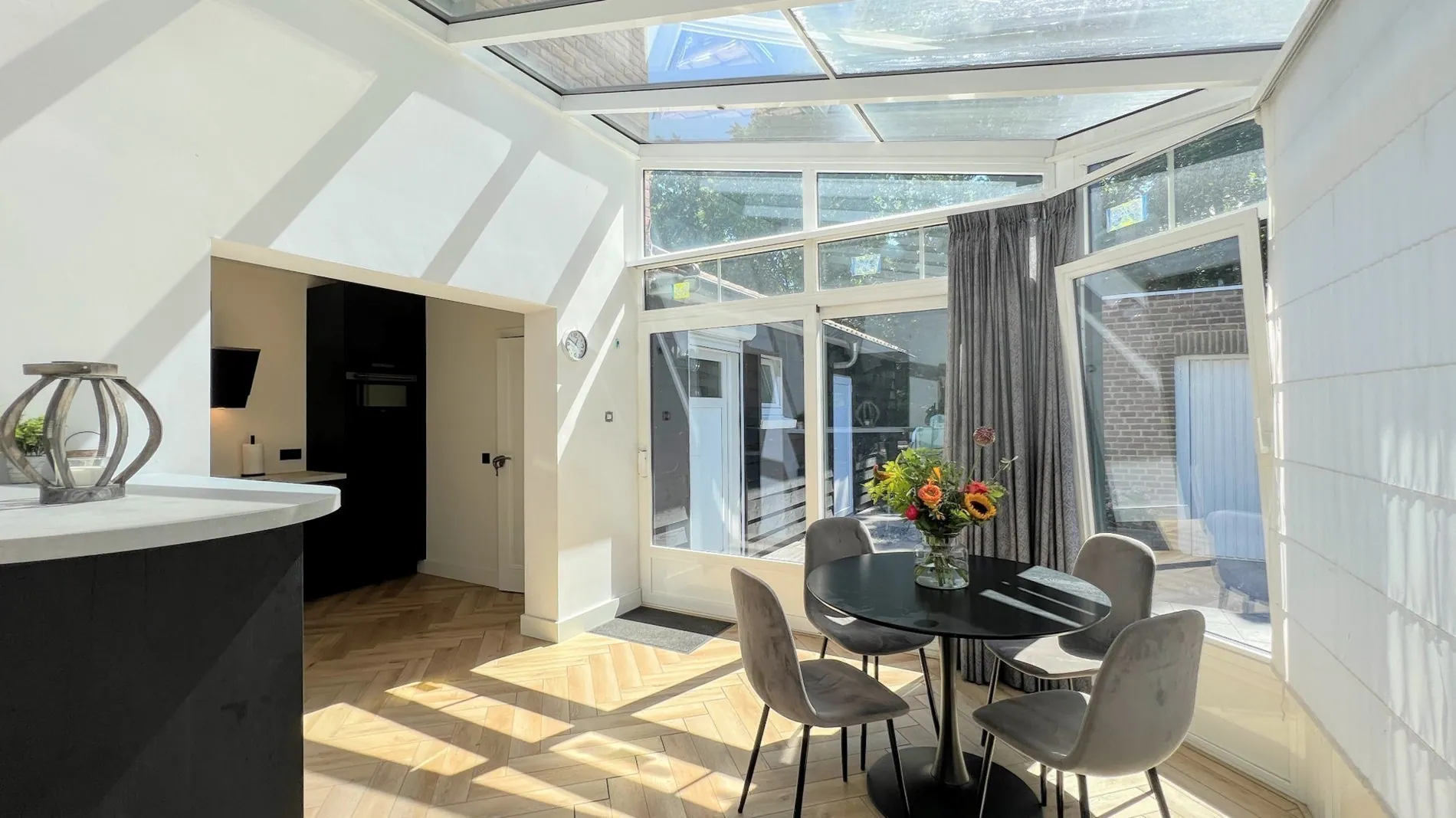 Bij betreding van de inkomhal word je meteen begroet door de ruime woonkamer. Van daaruit leidt de weg naar de modern afgewerkte keuken. Deze profiteert van veel natuurlijk licht dankzij de aangebouwde veranda. Er is daarnaast ook nog een bergruimte aanwezig.
