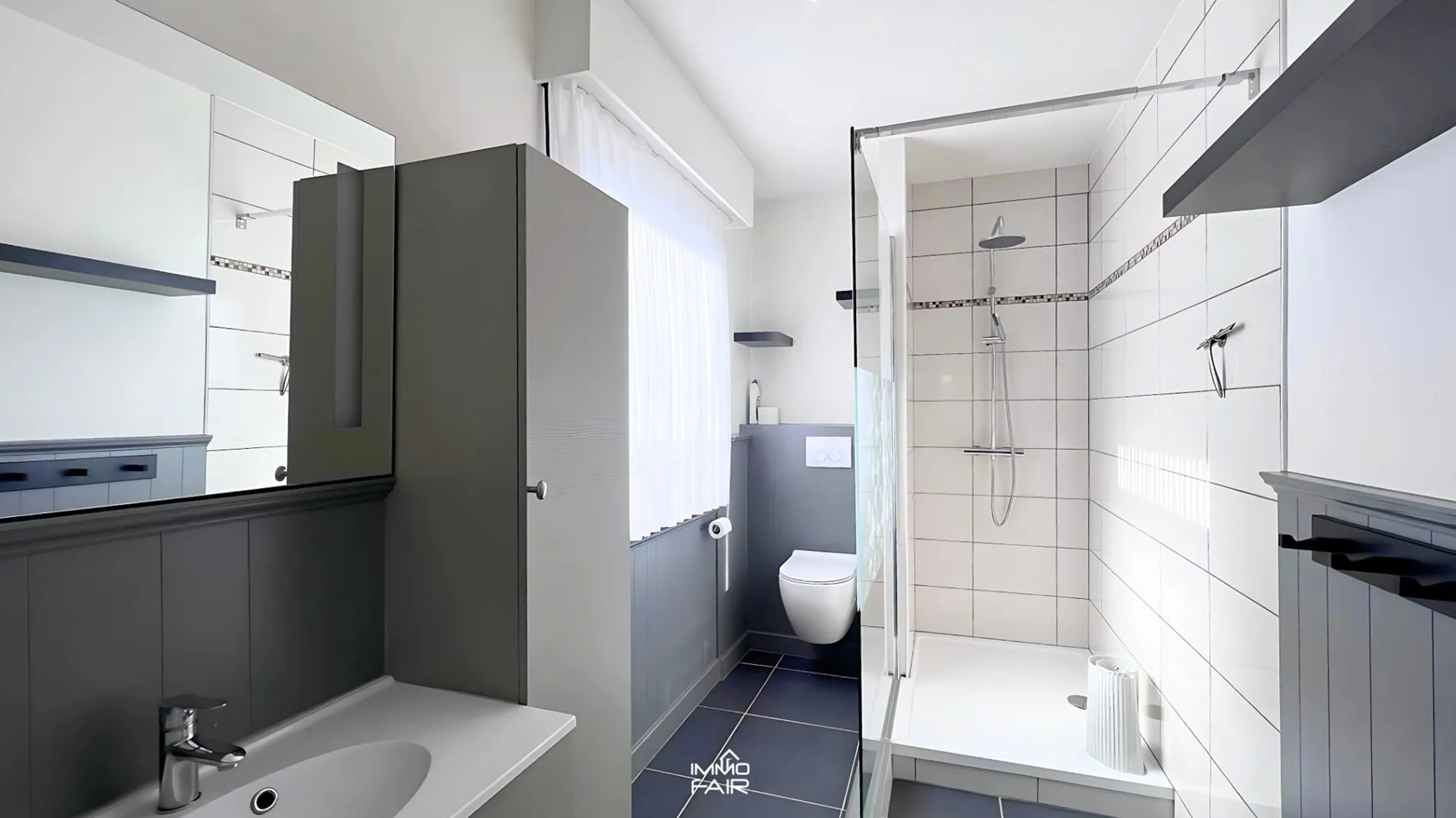 De nachthal geeft uit op drie ruime slaapkamers van 22, 16 en 12 m², een bergruimte en de badkamer. De badkamer is uitgerust met toilet, lavabomeubel en inloopdouche.