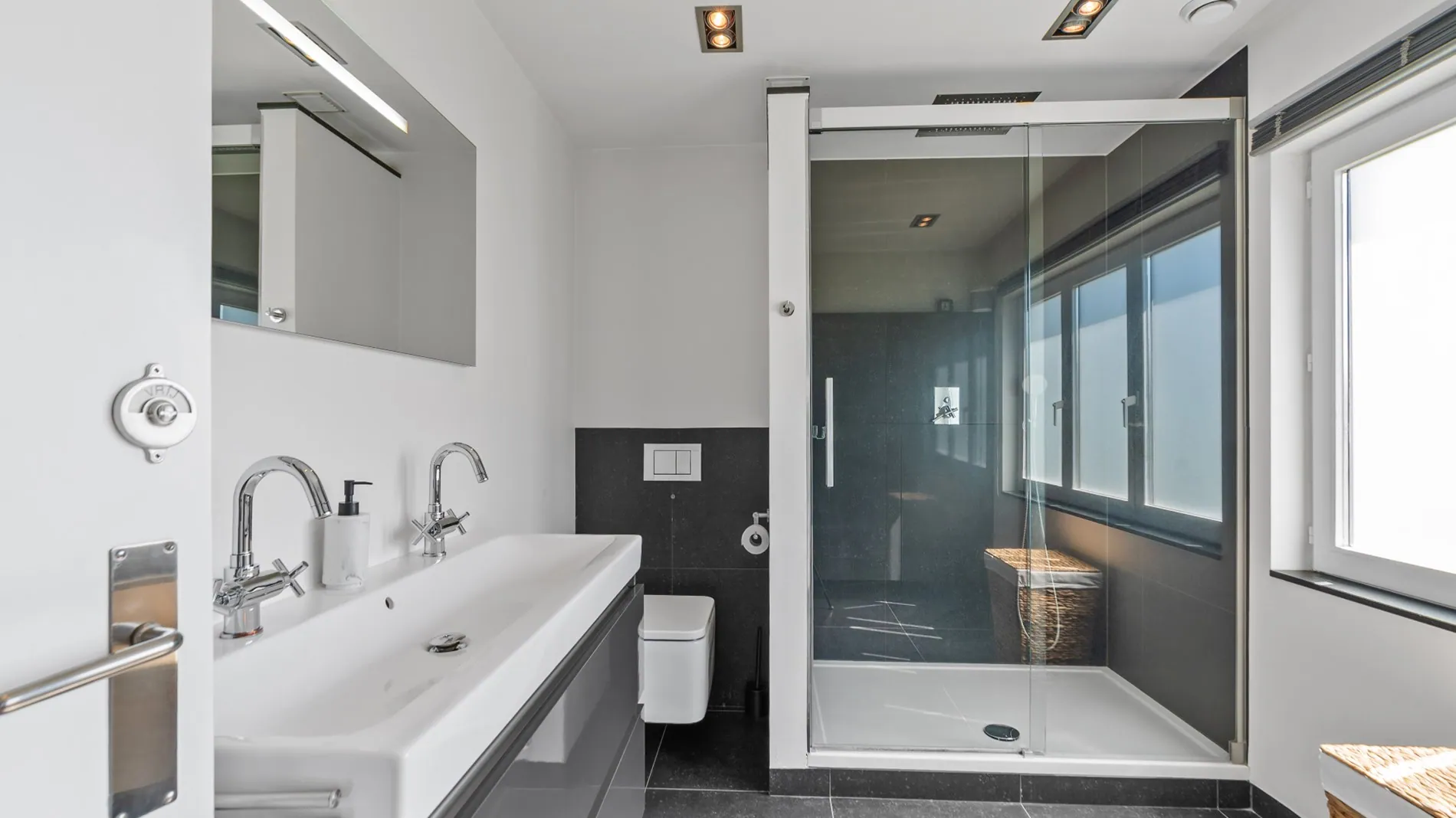 Op de eerste verdieping bevinden zich twee volwaardige slaapkamers en een derde ... kamer. Deze wordt momenteel gebruikt als berging/dressing, maar biedt ook potentieel als kinderkamer of bureauruimte. De badkamer is volledig betegeld en stijlvol ingericht met een ruime inloopdouche, dubbele lavabo en een nachttoilet.